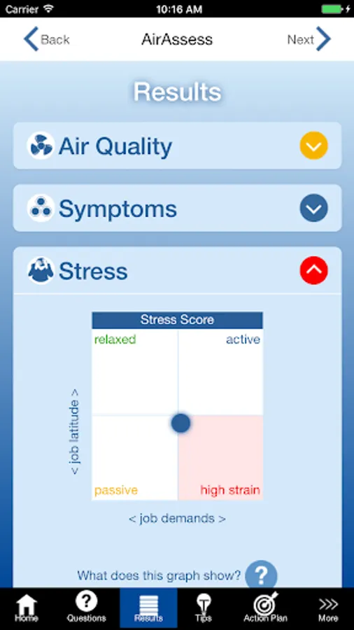 Indoor air quality issues at work can be caused or aggravated by a number of factors. The interrelationships between these factors can be quite complex. By answering some simple questions about your environment, symptoms, workplace stress levels, and allergies, you’ll discover issues which may be related to the air quality in your workplace. This app will look for links and provide you with some ideas to help take action on these air quality issues.