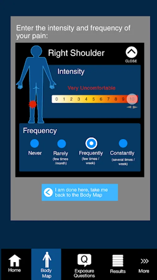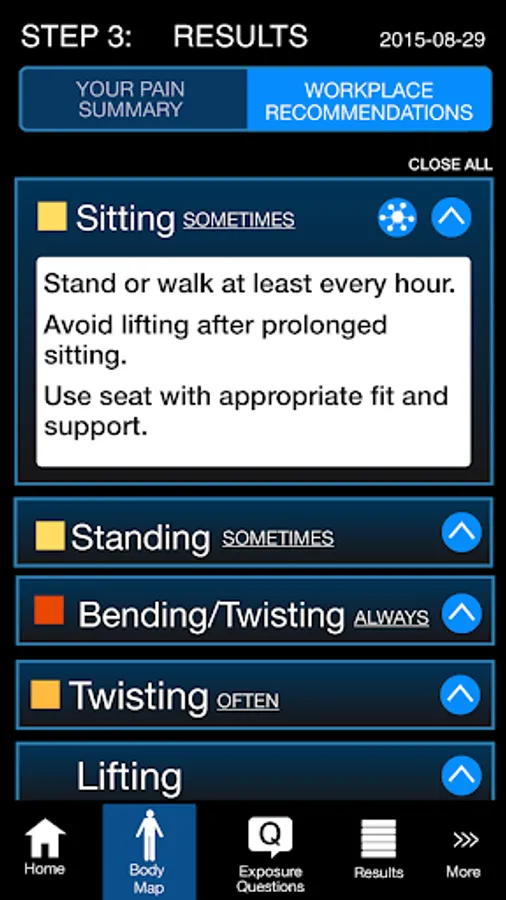 Download this useful app that delivers a very basic ergonomic assessment by running through a series of diagrams and questions to pinpoint musculoskeletal pain, identify possible sources, and discover practical solutions - right from your smartphone! The results are depicted on a body map, with recommendations to address work-related MSD hazards that could be contributing to your discomfort. No personal data is collected, but summary results can be shared with others (at your discretion) in order to report hazards or foster solutions.