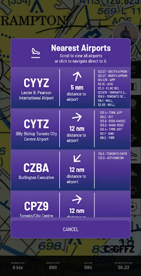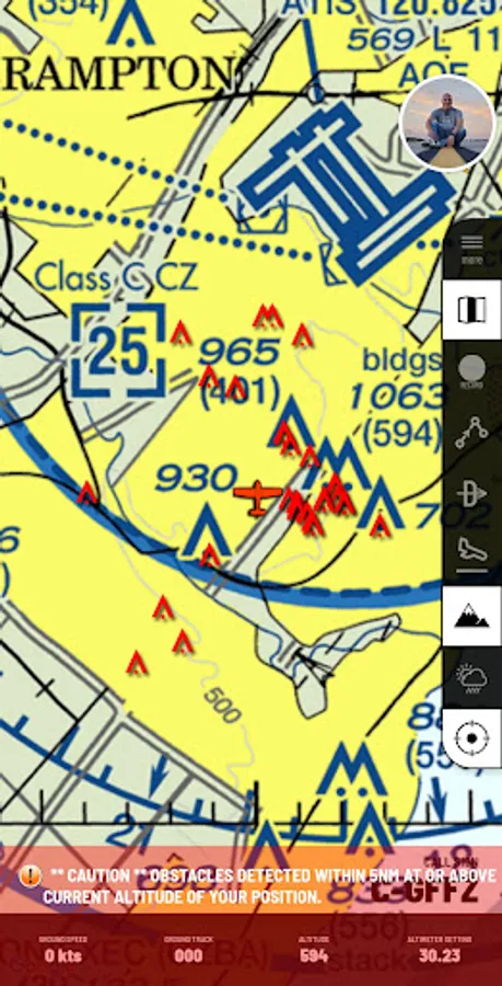 Navigate with a piece of mind, knowing GA Flight Tracker will keep an eye out for any obstacles that may be around you within a 5nm radius, at or above your current altitude. Warnings displayed on the screen so you can see their position and be notified of the closest danger.