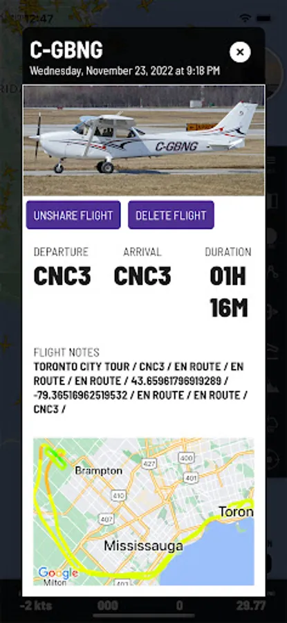 Keep history of your flight logs automatically with duration of flight, departure and arrival airports, and any custom notes.
