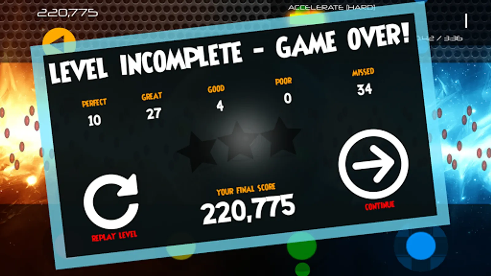 Each missed or wrong button you press will cause your beat line to vibrate. The more you get wrong, the bigger the vibration. Watch out for the closing wall, because if your beat line touches the wall, your game is over! Successfully complete the level and unlock all 12 levels.