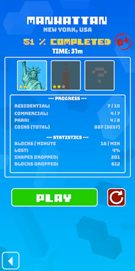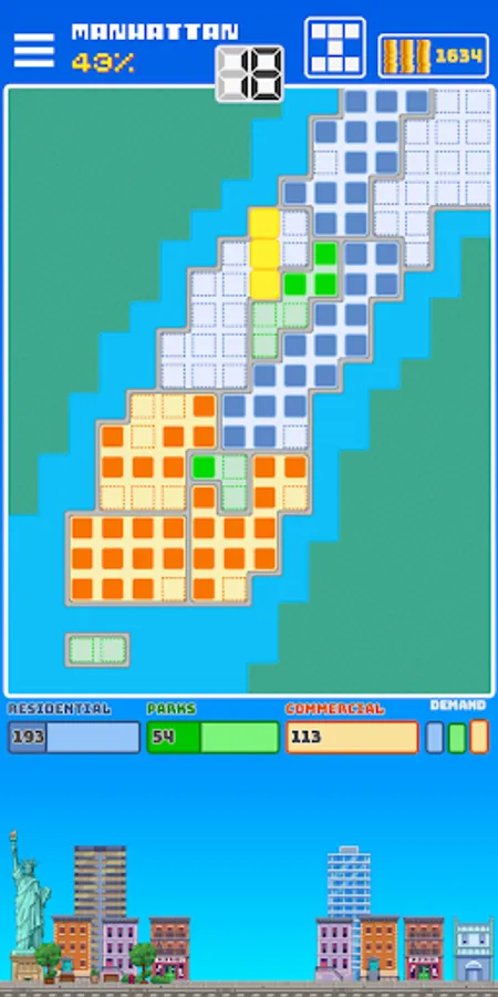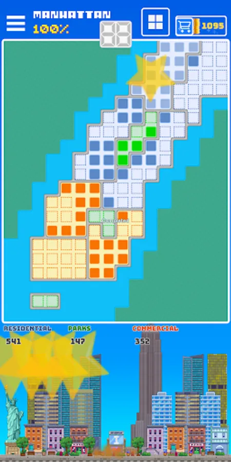 Build city landscapes by filling district zones with blocks. Once filled, a district provides points used to construct new buildings. Raise city landmarks by collecting special stars.