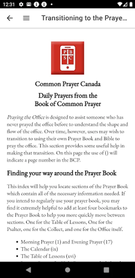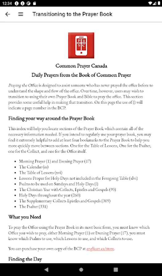 • Instructions to transition from using the app to praying with a Prayer Book and Bible.
