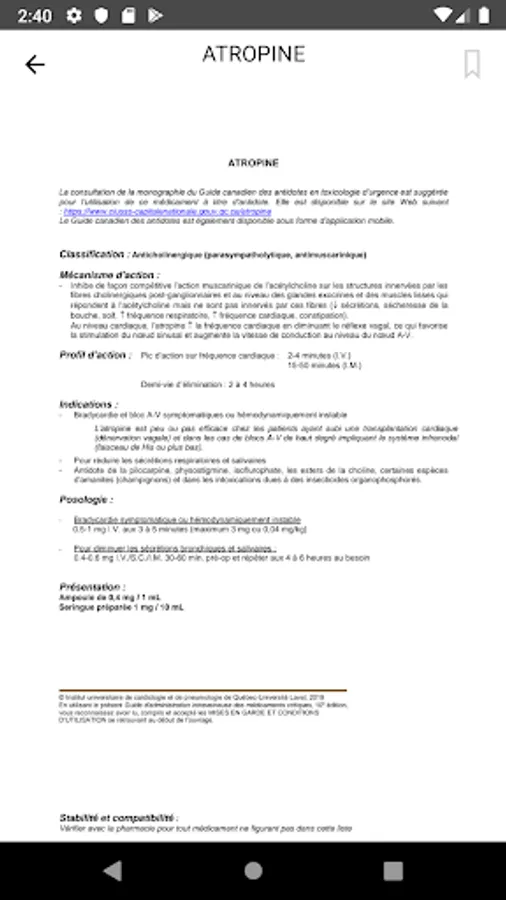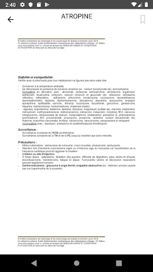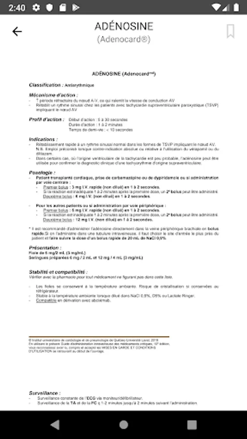 The Intravenous Drug Delivery Guide is intended to be a convenient reference book for physicians, pharmacists and nurses involved in the intravenous administration of critical drugs. The guide includes about sixty of the most used drugs in critical care. Each drug sheet provides information on classification, mechanism of action, action profile, indications, dosages, available IUCPQ presentations, stability and compatibility data and precautions, in addition to infusion tables for several drugs. However, the user must take into consideration that the guide was first created by and for the health professionals of the IUCPQ with the peculiarities of this ultra-specialized environment. The use of the guide must be adapted according to the environment.