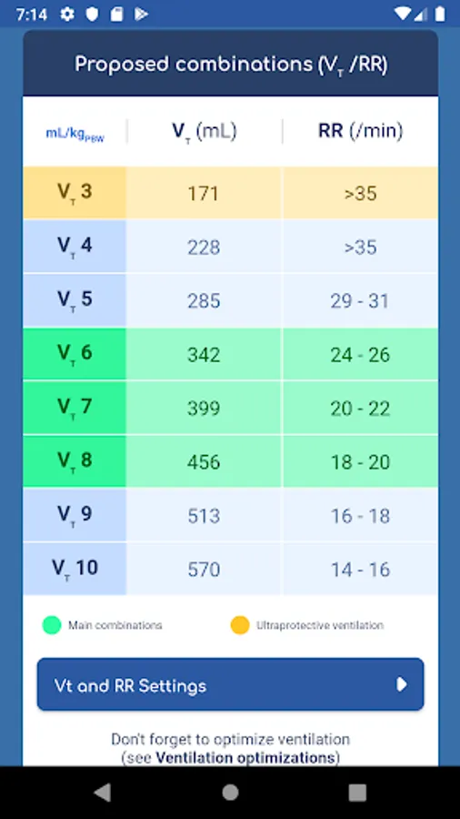 The initial settings for minute ventilation (tidal volume (VT) and respiratory rate (RR)) will be proposed. The VT will be determined according to the predicted body weight, the body temperature and the type of patient (medical or surgical). VT/RR combinations for different targets of VT (3 to 10 mL / kg PBW will be provided, settings from 6 to 8 mL/kg PBW will be preferred). Educational texts are proposed to help other settings (PEEP and FiO2) in the different care contexts.