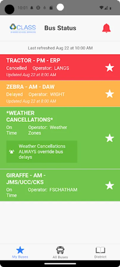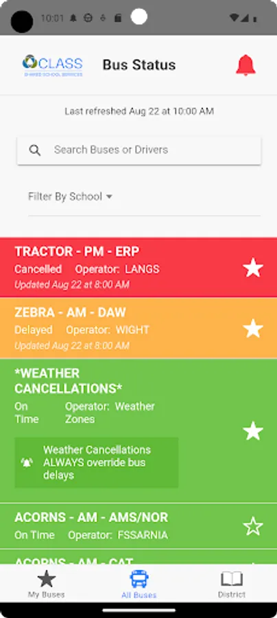 Only bus delays of 10 minutes or greater will be posted. For further information, including your bus symbol(s), please visit https://cklass.ca/services/student-transportation/delays-cancellations/