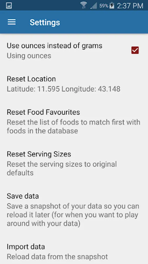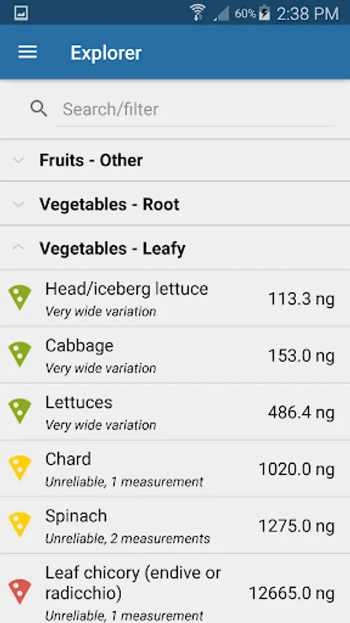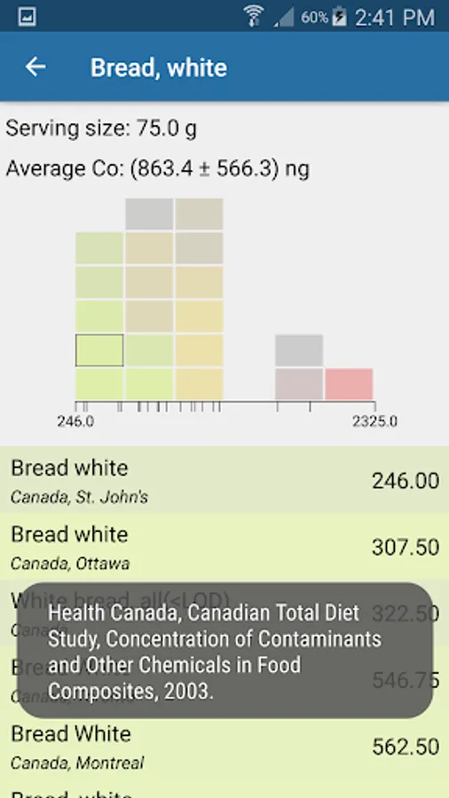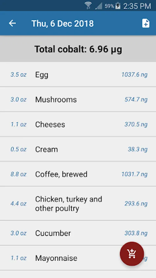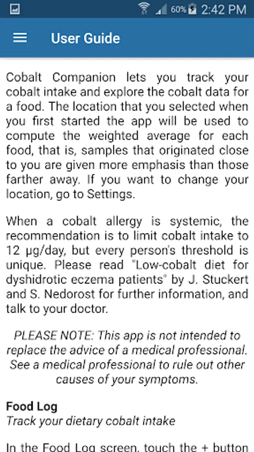 Cobalt Companion is a support tool for individuals on a low-cobalt diet. A food journal lets you track your daily cobalt intake. You can browse though the food groups to see which foods are the lowest or highest in cobalt, and you can search for a particular food and drill down into its data to understand how its cobalt content varies. The data is a compilation of many sources, including national food studies and scientific journal articles. The average values are weighted to your location so that the samples most geographically relevant to you are given priority. No internet connection is required.