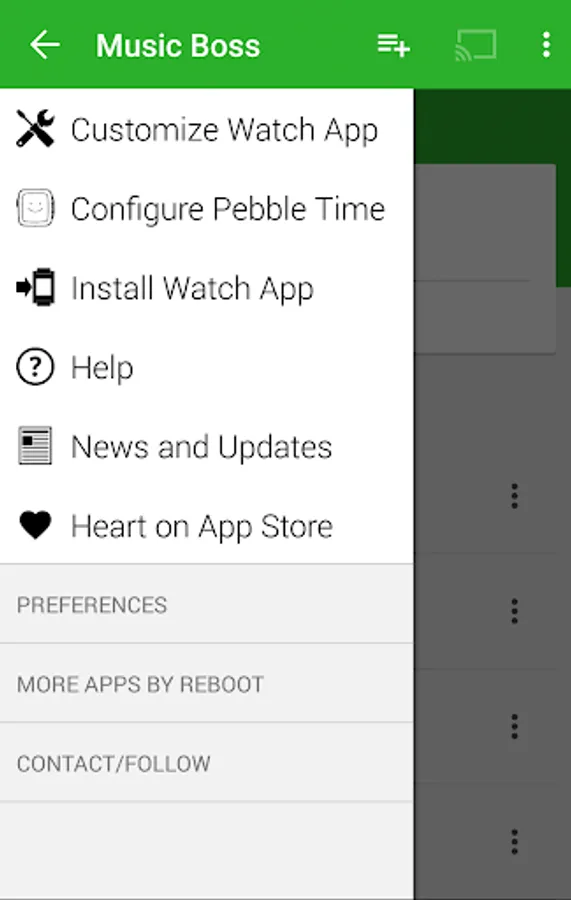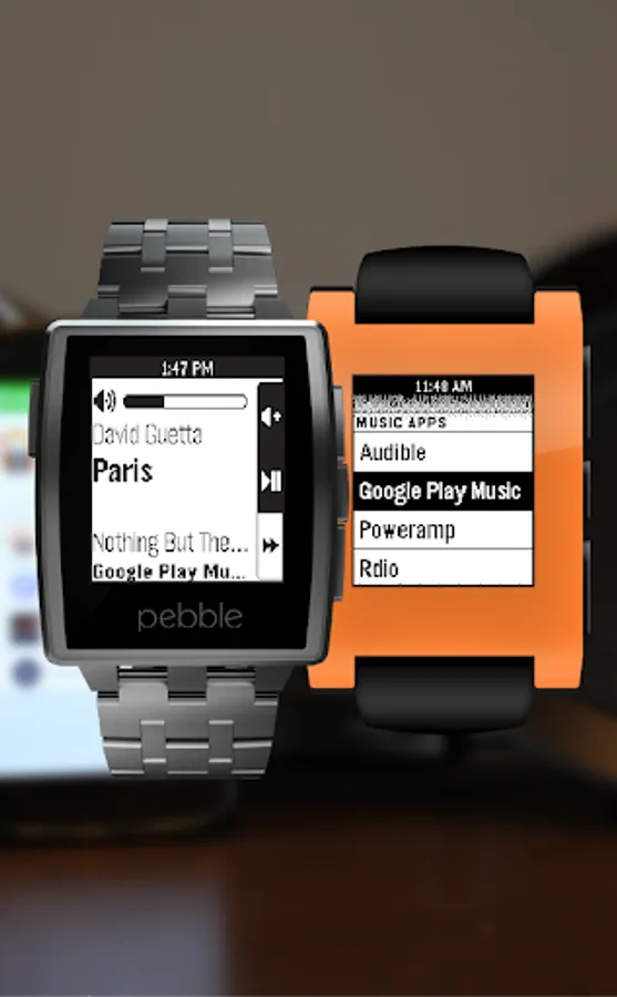 Music Boss gives you total control over your Music/Audio App (Retune, Audible, Google Play Music, PowerAmp, etc) using the Pebble's existing Music Watch App or the Music Boss Watch App. Music Boss allows you to create a list of your favourite music apps and quickly change which one responds to the media commands on the Pebble Watch.
