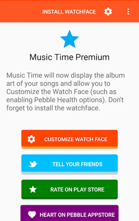 Music Time is the watch face that lets you enjoy your music even when you aren't listening to it. The watchface adapts to the color of the current album art and will even display the current album art for users that have upgraded to premium (in app). Premium users can also enjoy watch face customizations; show or hide information and even enable Pebble Health step count display.