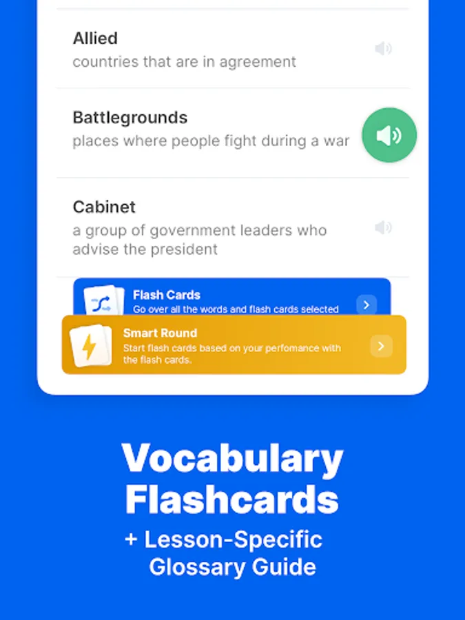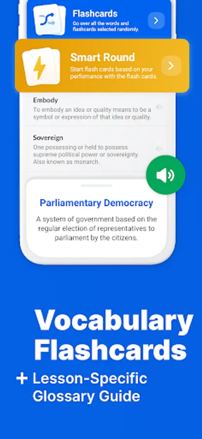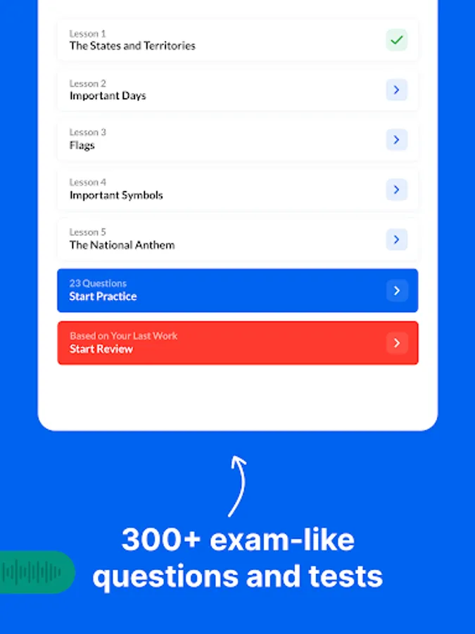 Don't know the meaning of a word? No worries! Access to a full content-focused flashcard and dictionary to improve your vocabulary while studying for your citizenship test.