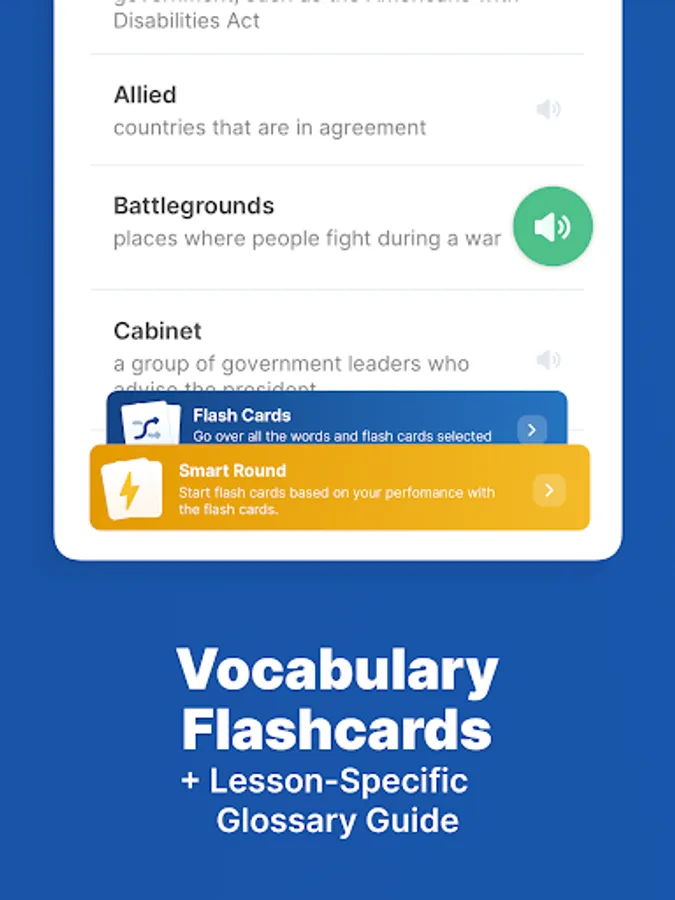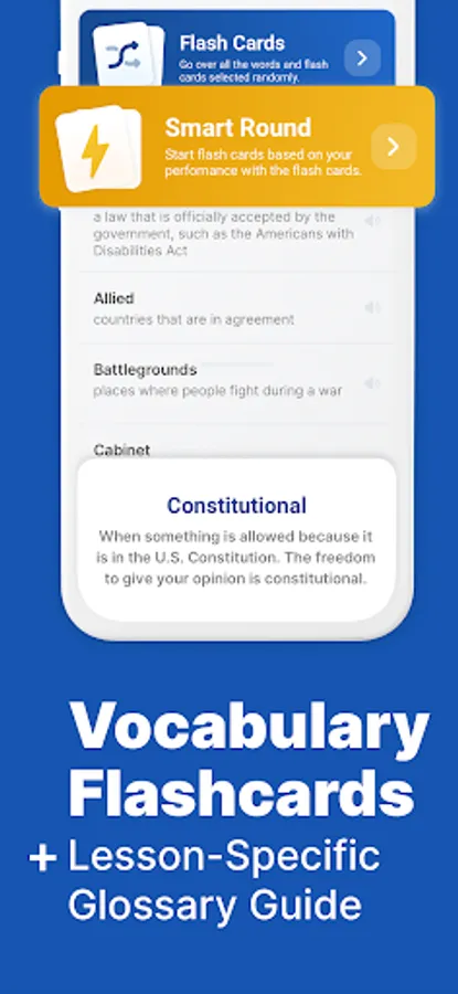 Bump into an unfamiliar word? We've got you covered with our content-focused flashcards and dictionary that boost your vocabulary, an essential tool for studying for your US Citizenship Test 2023.