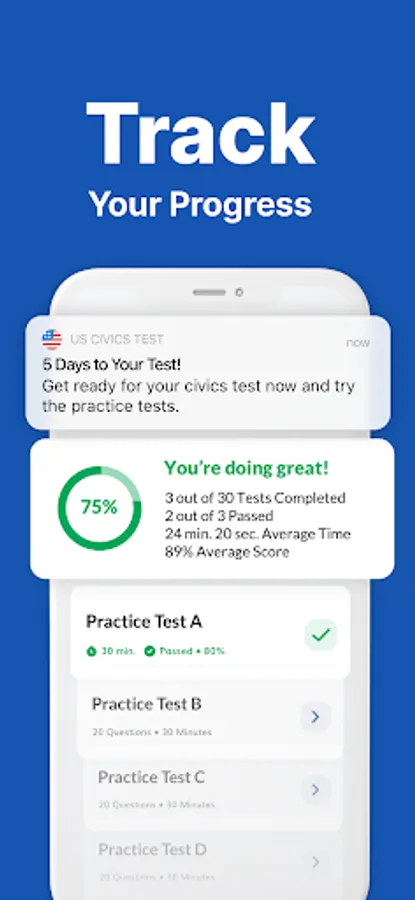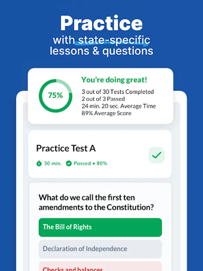 We provide an extensive platform for thorough practice to help you ace your US Citizenship Test 2023. Study systematically chapter by chapter, and attempt more than 300 questions at the end of each lesson. Practice tests help you evaluate your knowledge while feedback on correct and incorrect answers enhance your learning process.