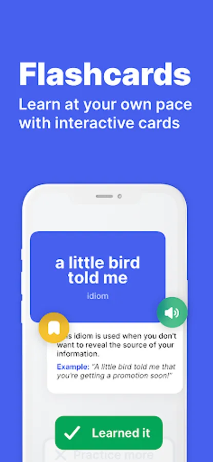 Learn from more than 1,300 essential English idioms carefully picked by expert tutors. Use the Smart Round for personalised flashcards generated by our learning algorithm.