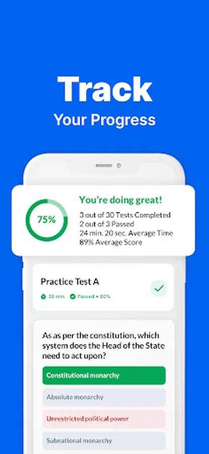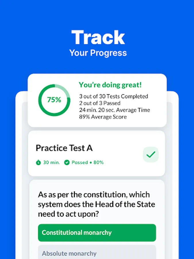 Allow us to guide you towards becoming a permanent resident or British citizen. Our Life in the UK prep app provides a vast repository of practice test questions, simulates actual test conditions, and lets you run a marathon session to gauge your readiness for the Life in the UK test. It's the ideal way to make sure you are well-prepared and confident for the real deal.