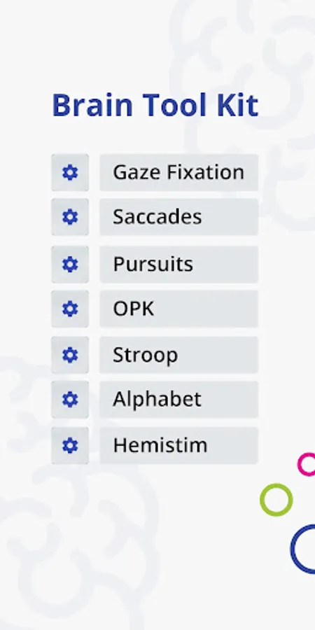 Brain Tool Kit uses eye movements, memory and coloured stimuli to exercise the brain. Examples for exercises are given as a starting point. Options include: Gaze fixation, pursuits, OPK, hemistim, saccades and anti-saccades, timed and interactive Stroop test where the user must make sense of incongruent stimuli; and random letter display that can be used to have the user say a word starting with that letter. Options for speed and length of activity are given for every item. Options for green, red or blue targets are given.
