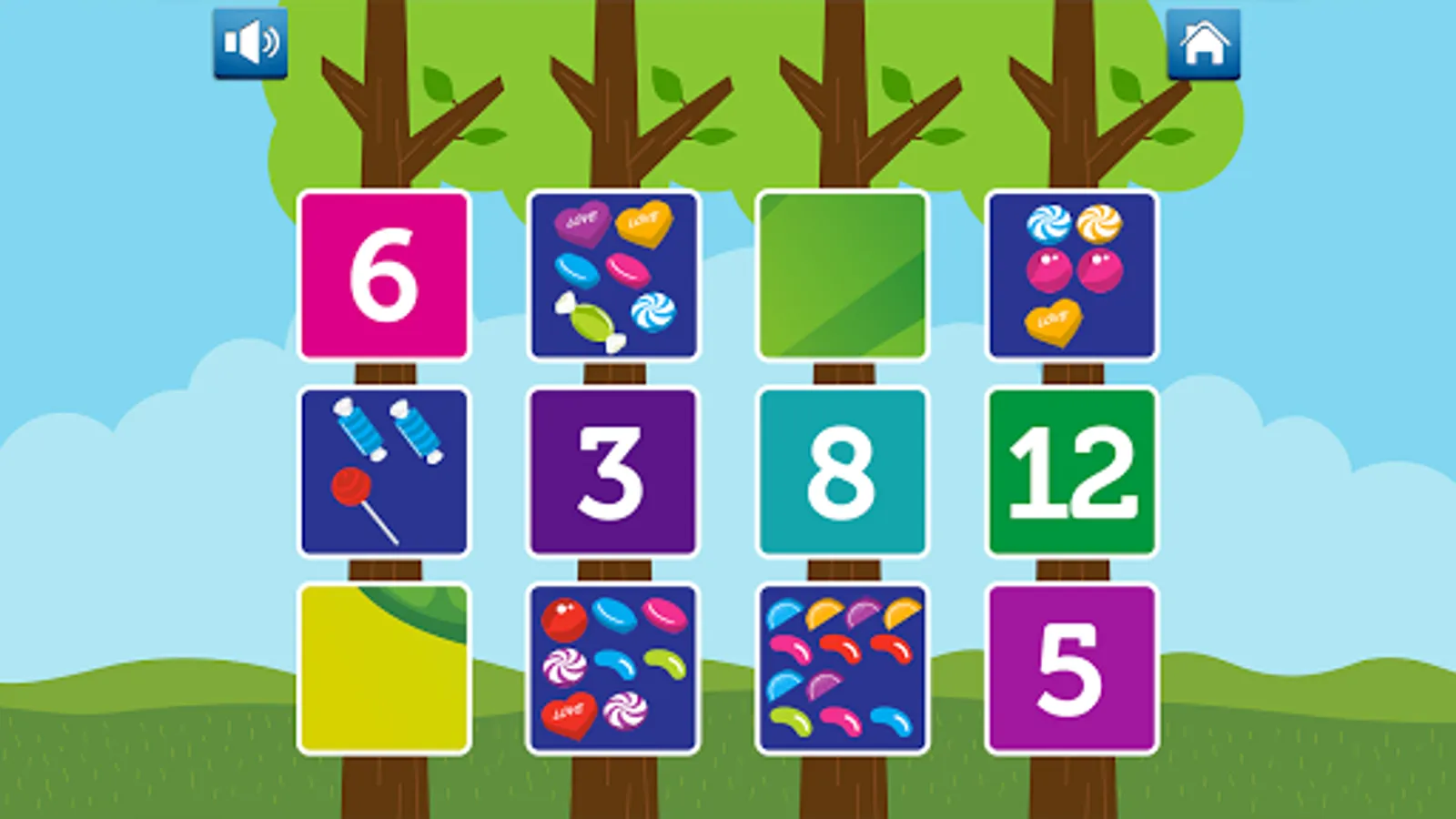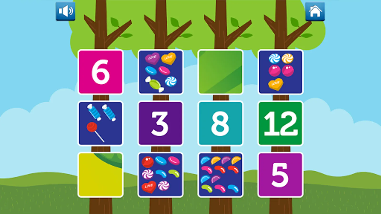 Match - Numbers from 1 to 12 are shown numerically and pictorially on flash cards. As children match each number with its picture the cards flip to reveal a puzzle piece. Once all the cards have been successfully matched the completed puzzle picture is displayed.