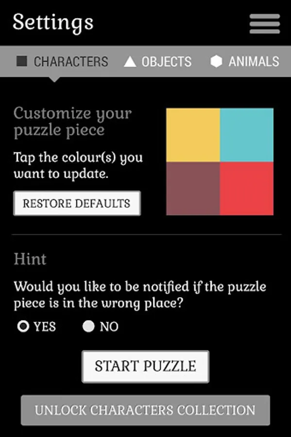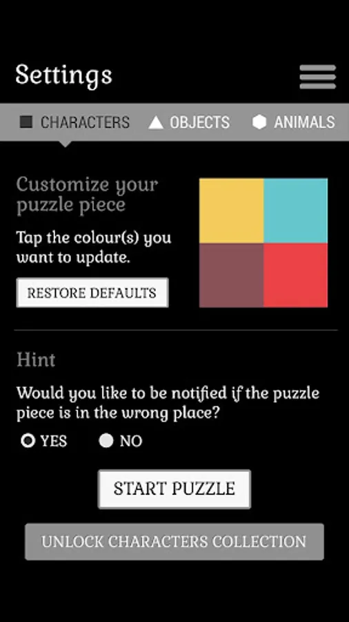 Challenge your skills using 6 uniquely colored triangle pieces to collect 25 object icons.