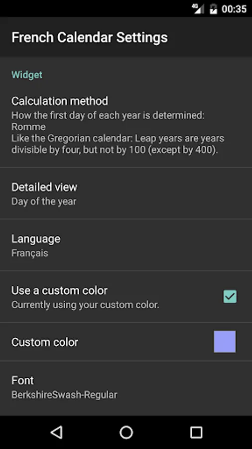 Resizable widget which displays the current date and time in the French Revolutionary calendar. The widget supports the following preferences: