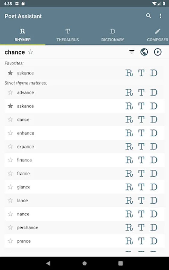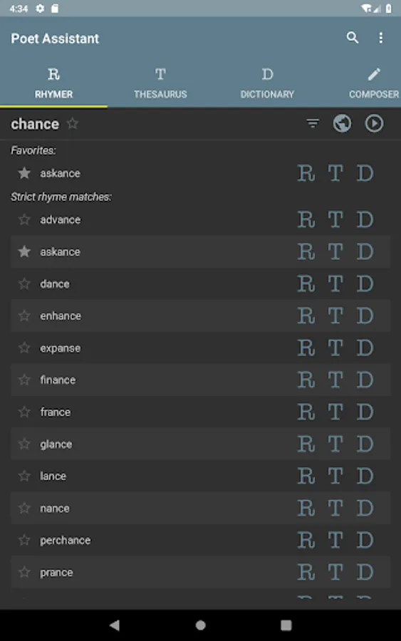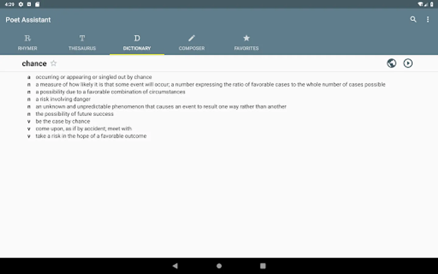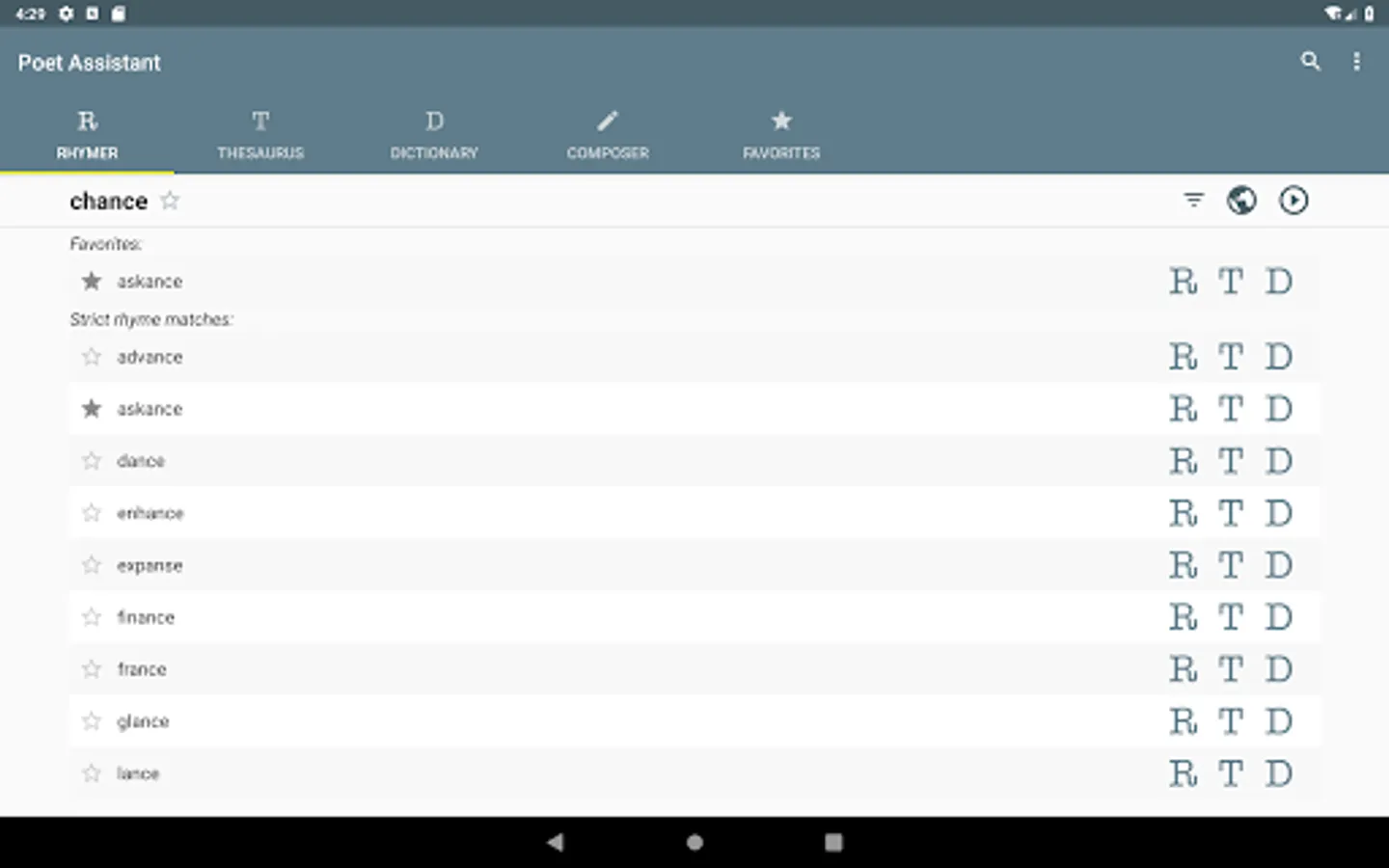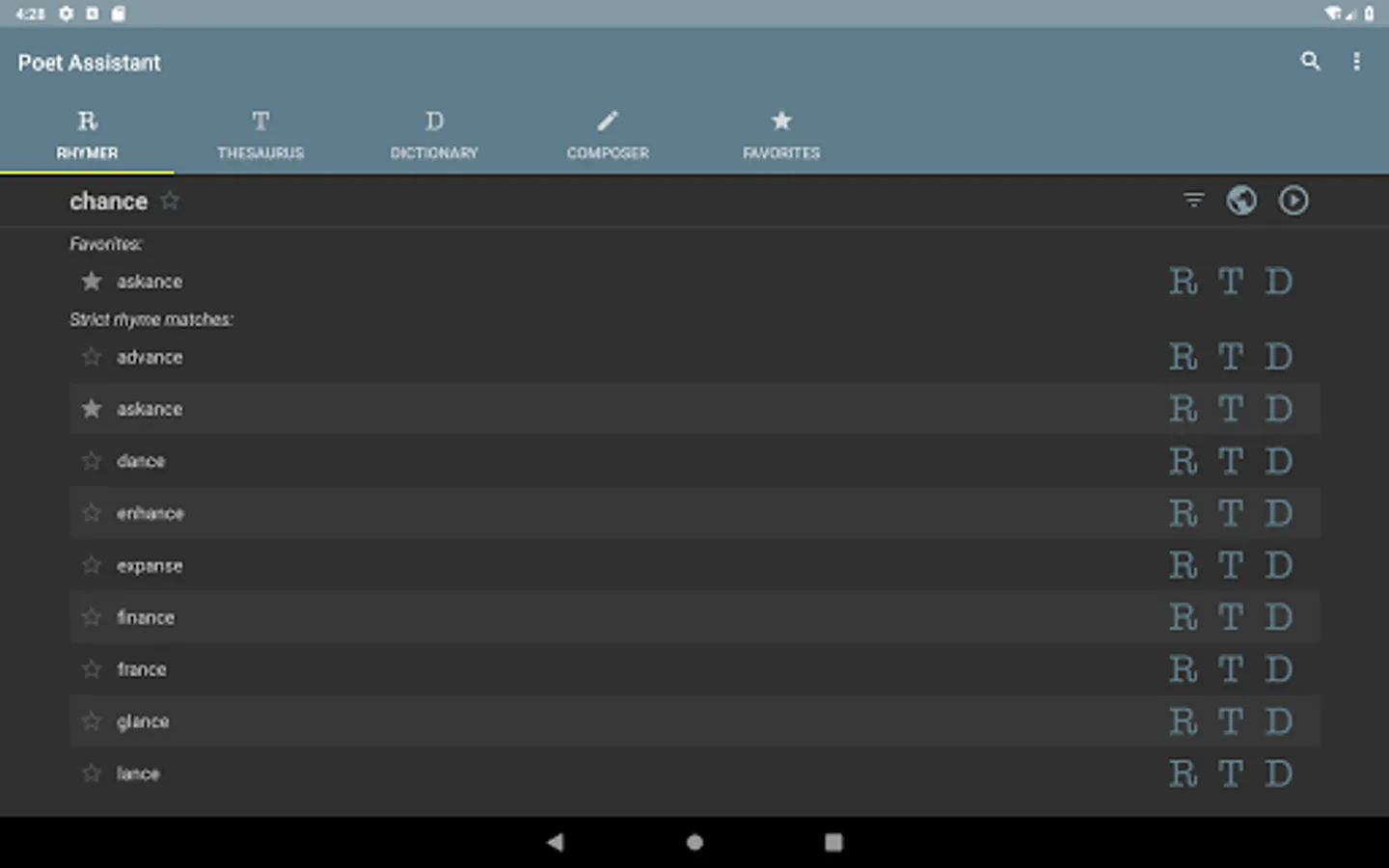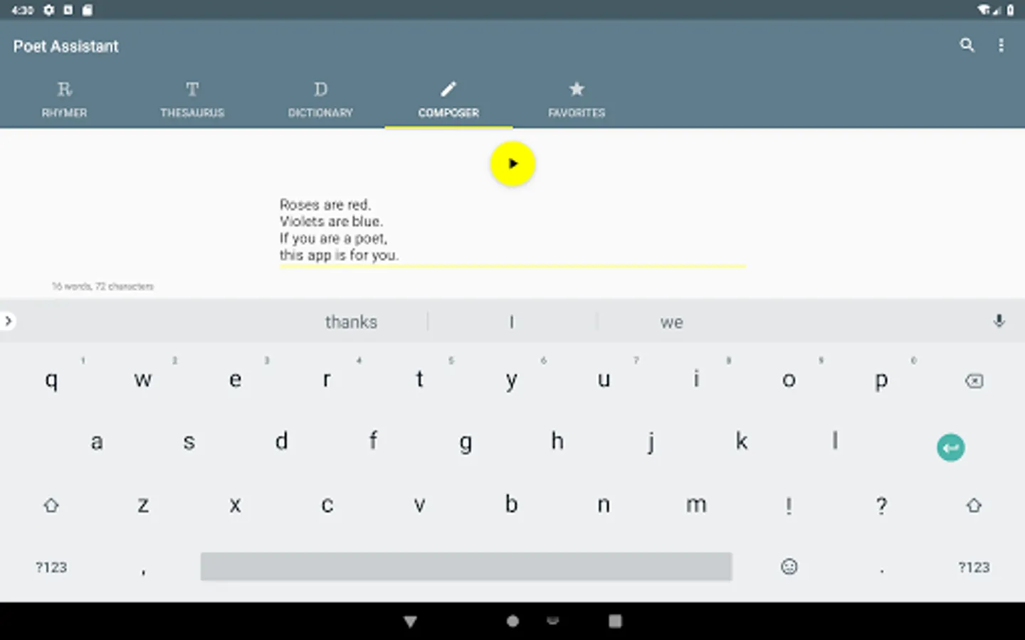 Note: This is the original Poet Assistant app. It is completely free, truly offline (no internet permission), no ads, and no in-app purchases.