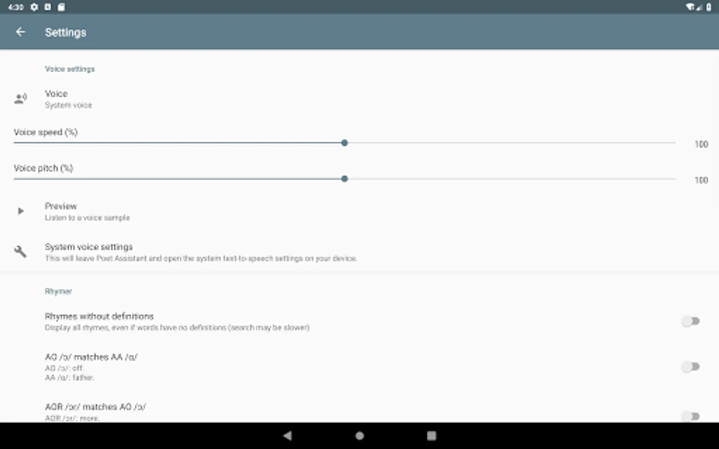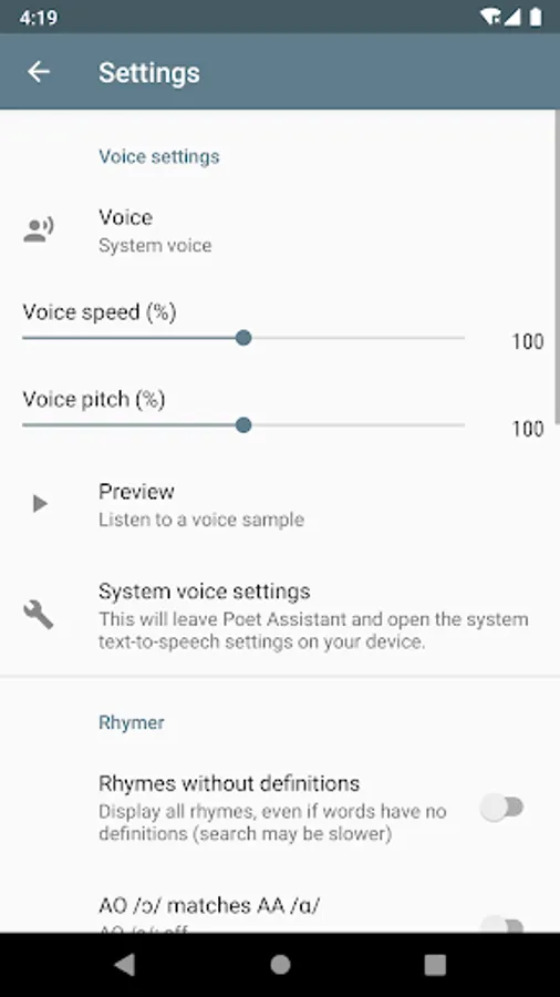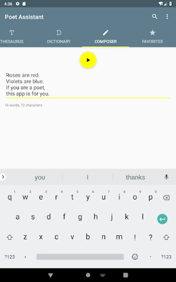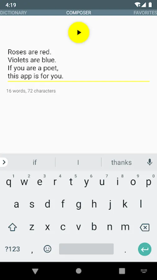 * a screen where you can enter your poem text, have it read aloud back to you by the device's text-to-speech engine, and see the word/character count.