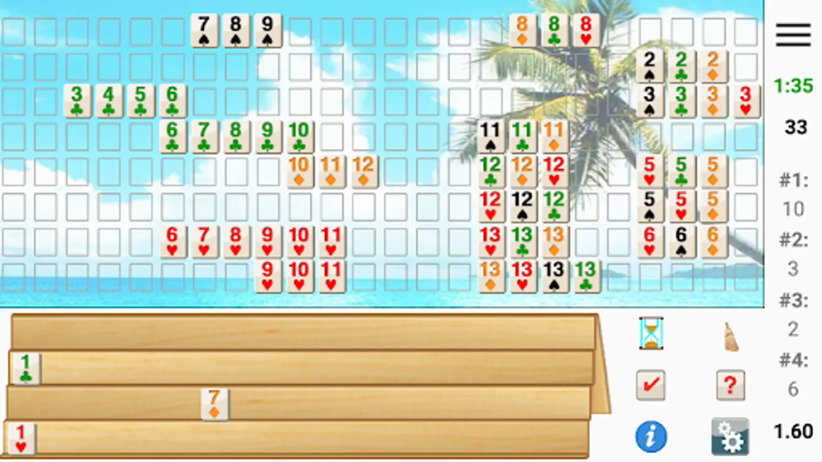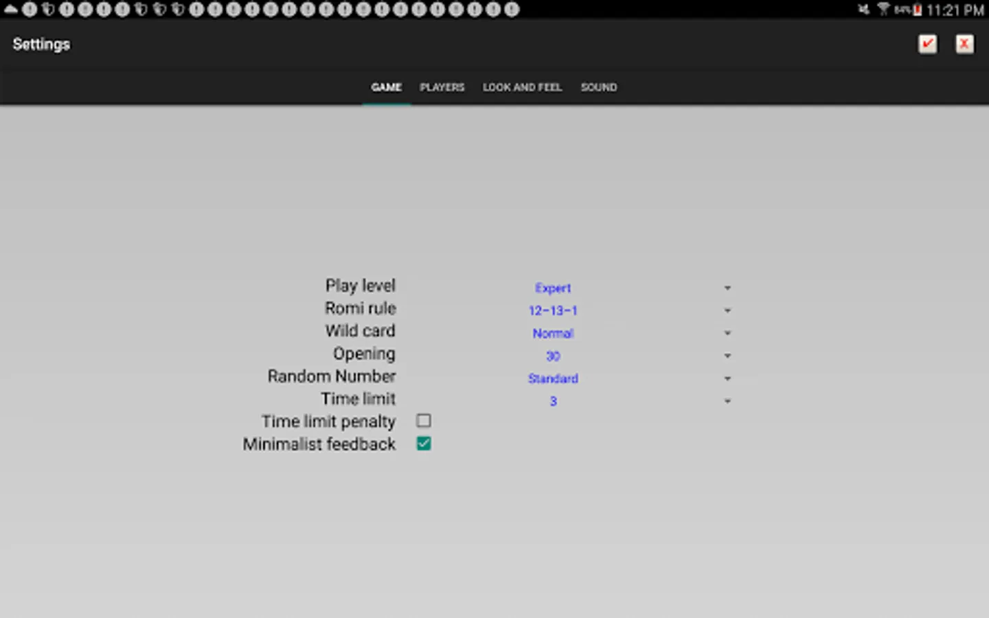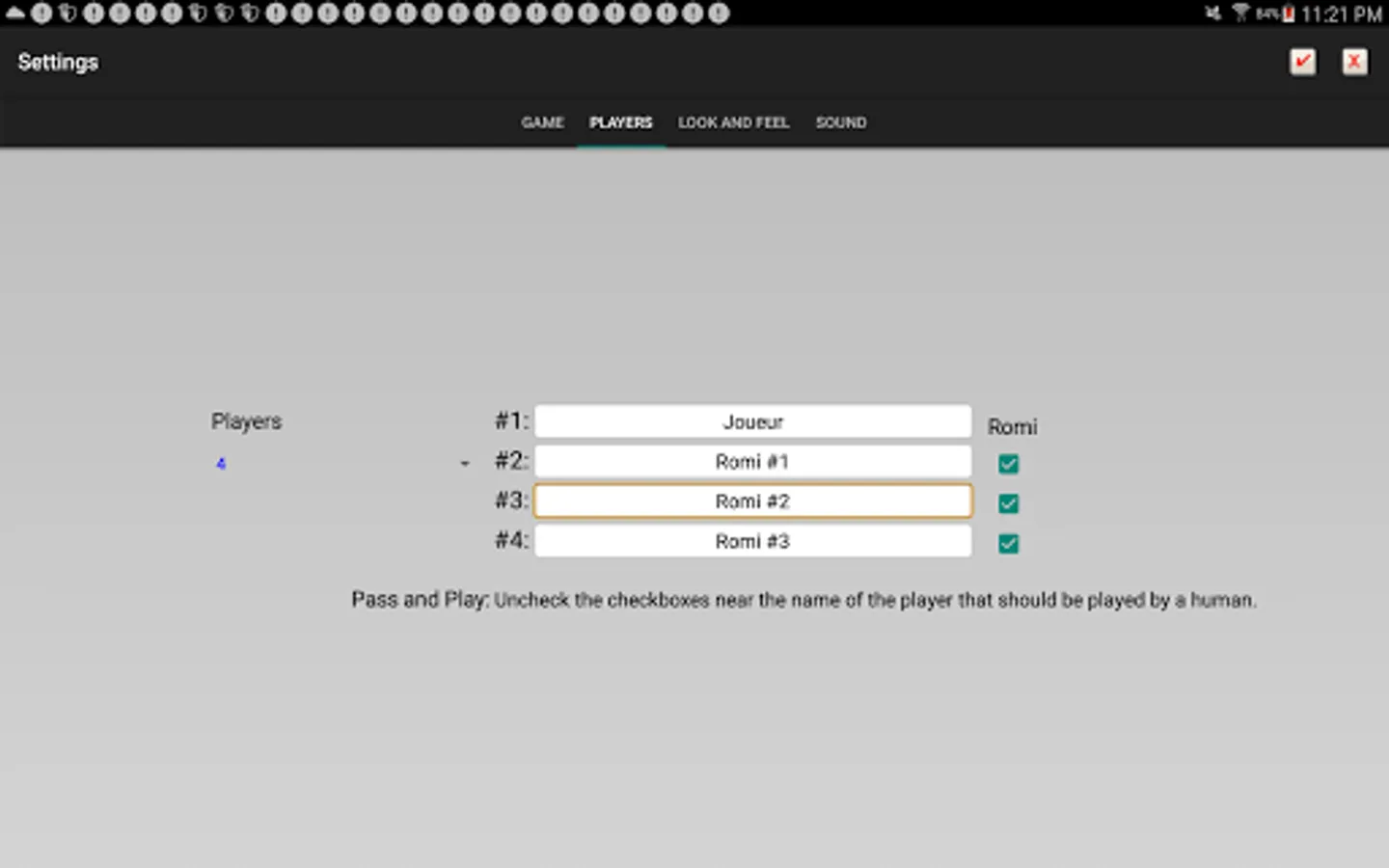 Romi lets you play Rummy Tile (RummyCube, Rummikub, Rami) games against the computer at three different levels. Romi is played with two sets of 52 cards and with two wild cards. The purpose of this game is to form groups of three or more cards, which contain either consecutive cards of the same suit or cards of the same number value but of differing suits.