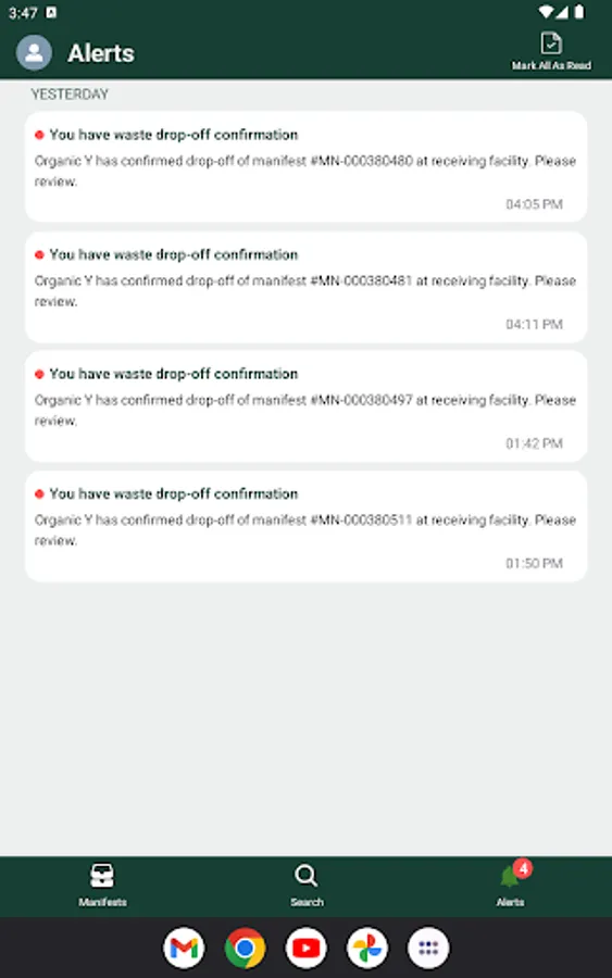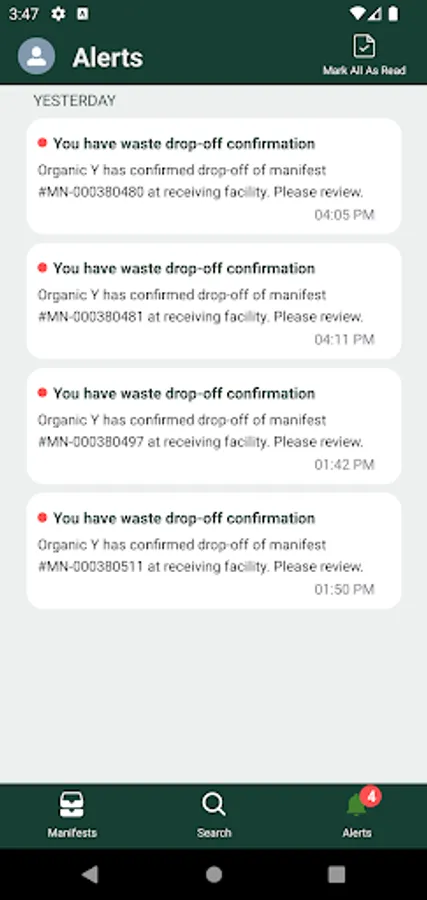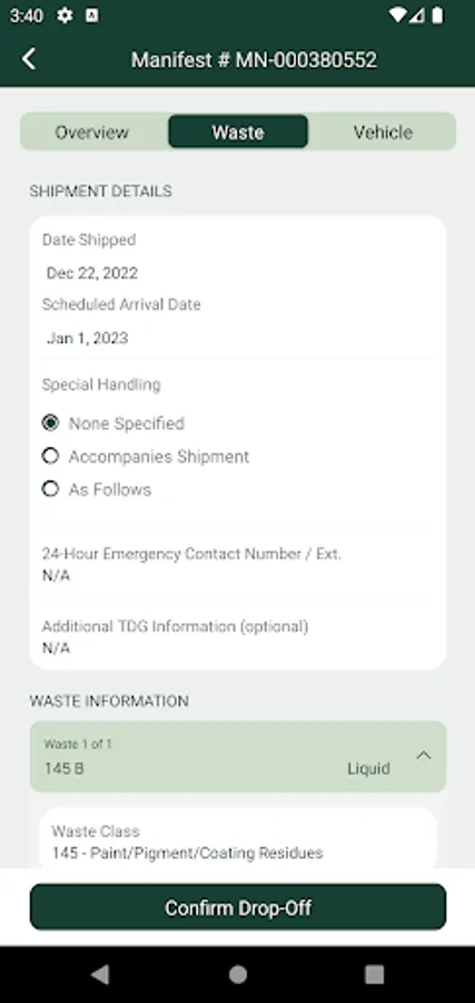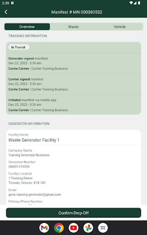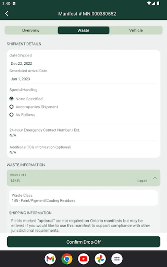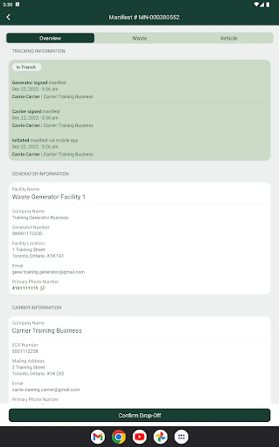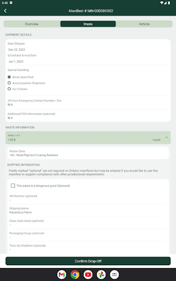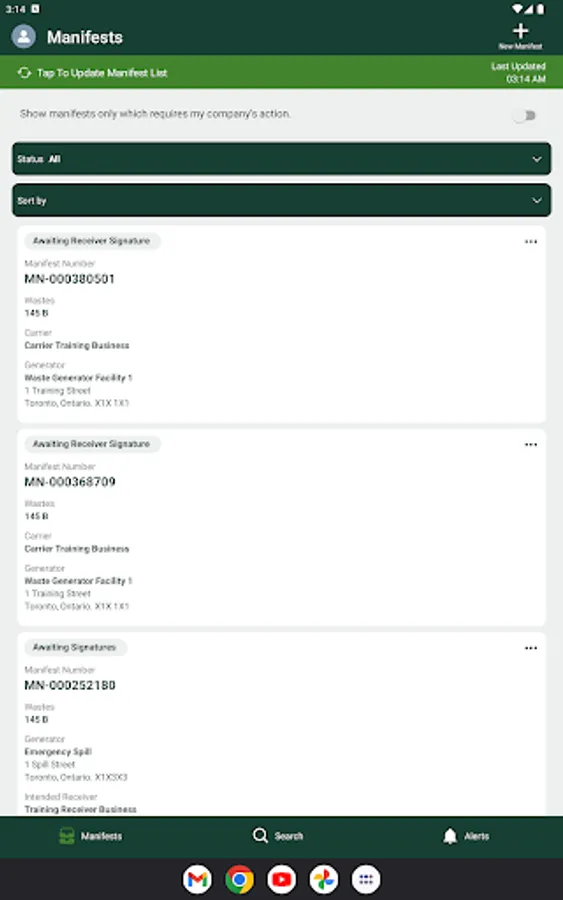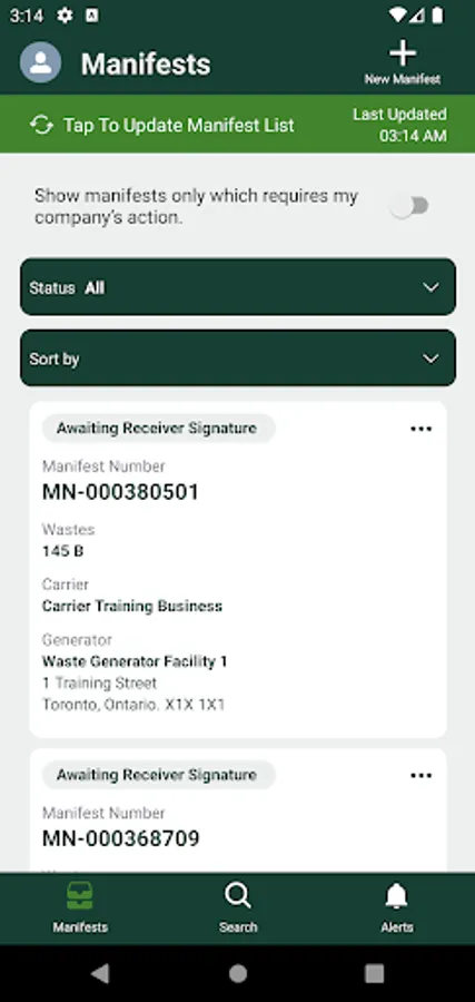 Manage and track manifests for Ontario’s hazardous waste program easily and effectively, and seamlessly integrate your manifest content with the Hazardous Waste Program Registry. All activities required for Ontario’s manifesting process, including signatures, refusals and corrections, can be accomplished through the app.