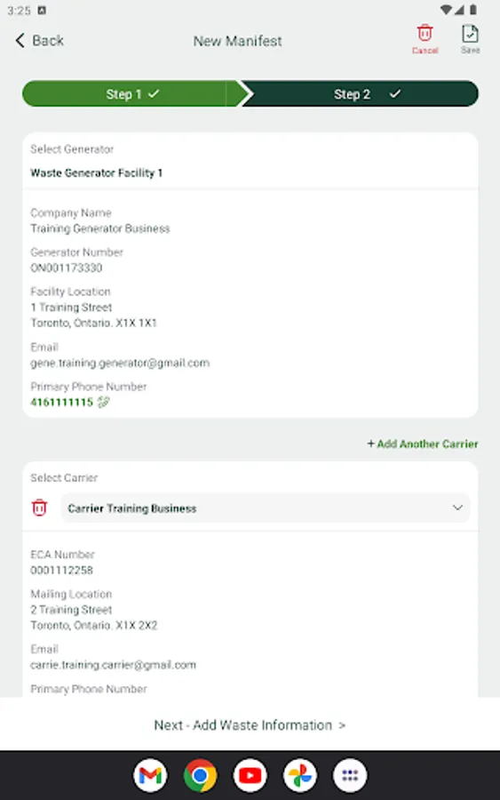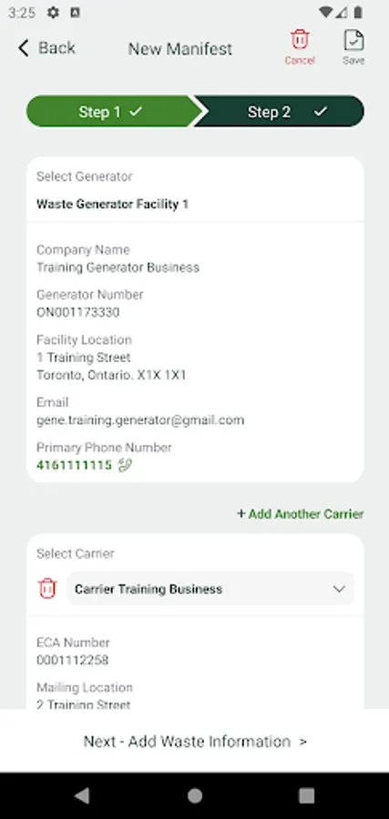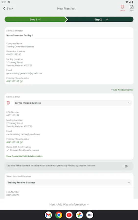 b. Add registered generator, waste stream, carrier and receiver information from the Registry