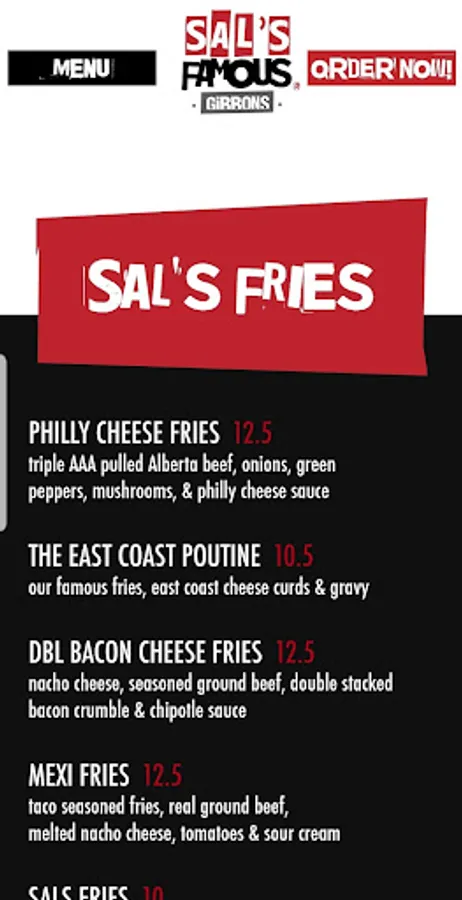 Get a taste of our app where you can view our menu, order, and review. Check out our newest Sals Fries where you can get a taste of the east coast poutine with classic cheese curds and more!