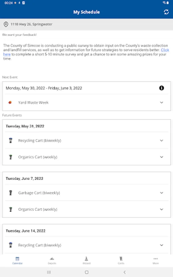 Garbage, recycling and green bin schedules and reminders for County of Simcoe, Ontario. View your garbage, recycling, and green bin schedule and receive collection notifications all from within this app.