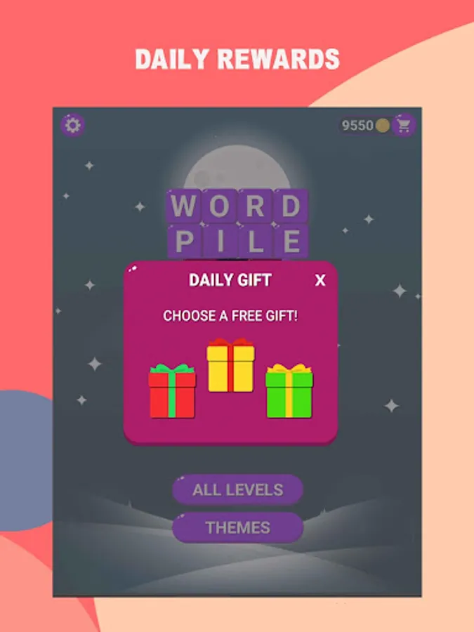 Words PileUp another word search puzzle game, as the puzzle changes as your find words! Letters are stacked on top of each others and will fall down when the words underneath them are selected. Find all the words for each category to complete the level..Find additional words to get rewarded on each 5 new words you find. gain coins on every completed category to unlock your themes.