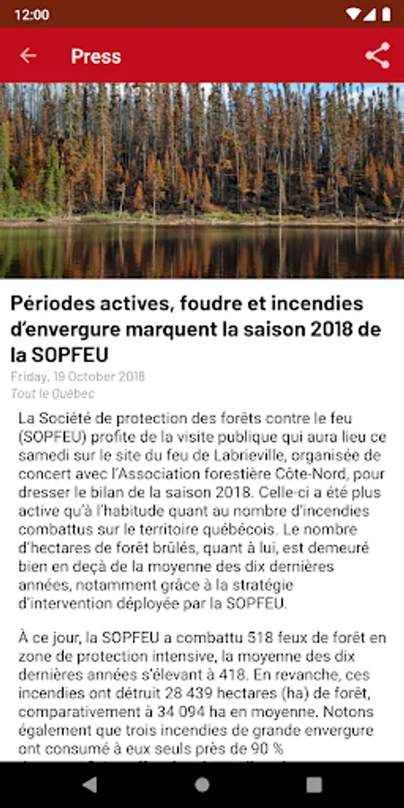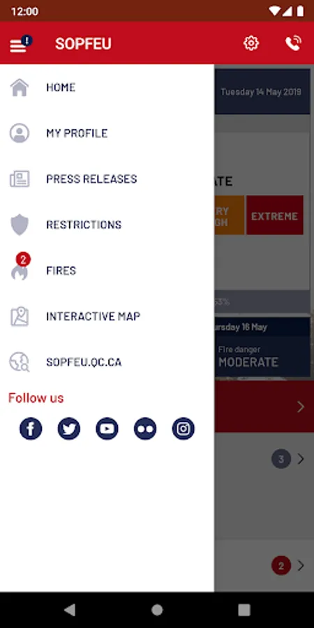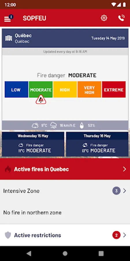 The mobile application SOPFEU provides information on the active forest fires , preventive measures in force and the fire hazard in your area. Friendly , it helps to know the latest developments on the situation in the forest. It will be easier to plan your stay in the forest with handy information about the fire hazard and the prohibition of making forest fires or near present in your area.