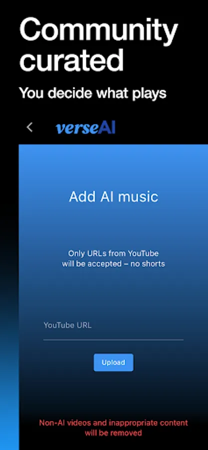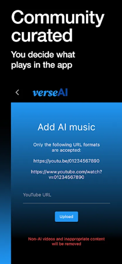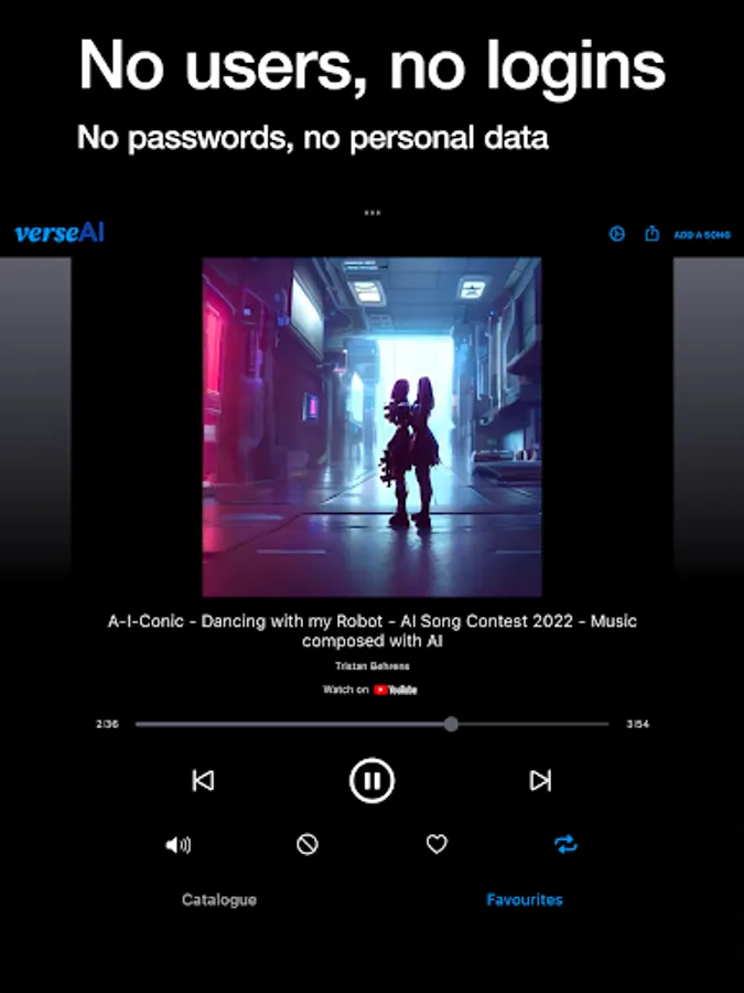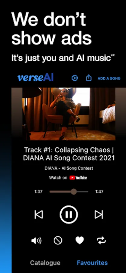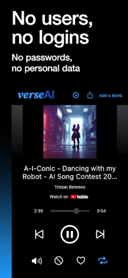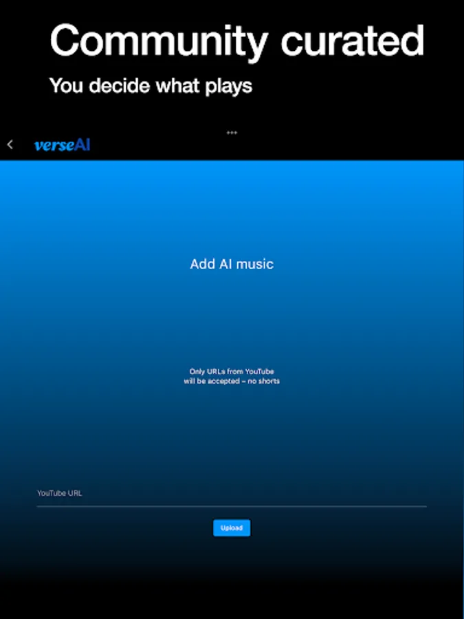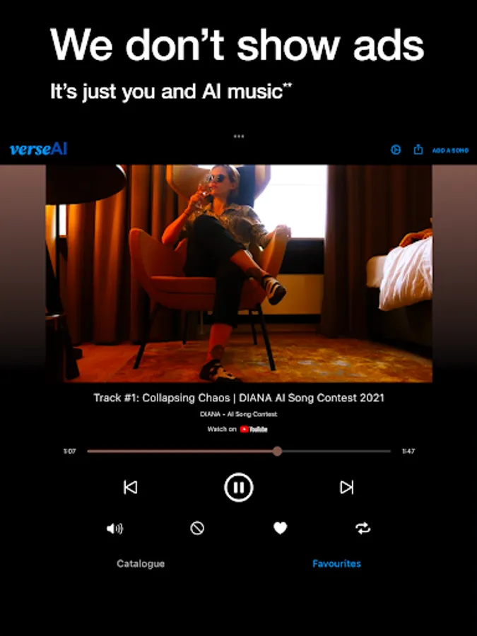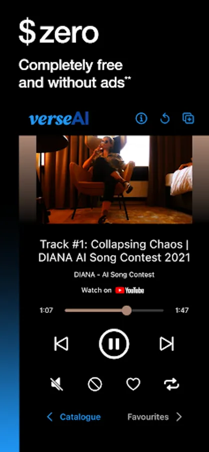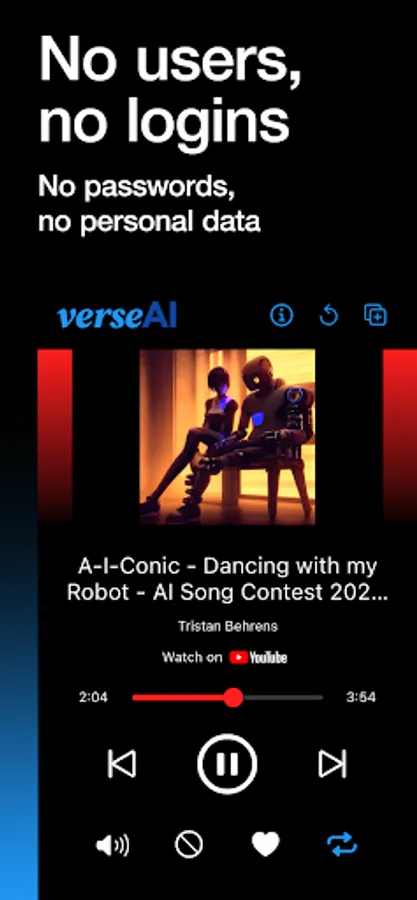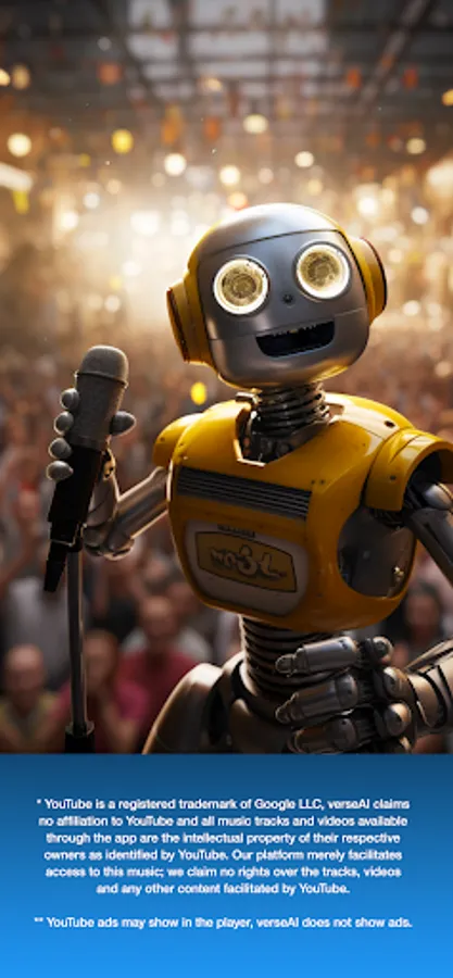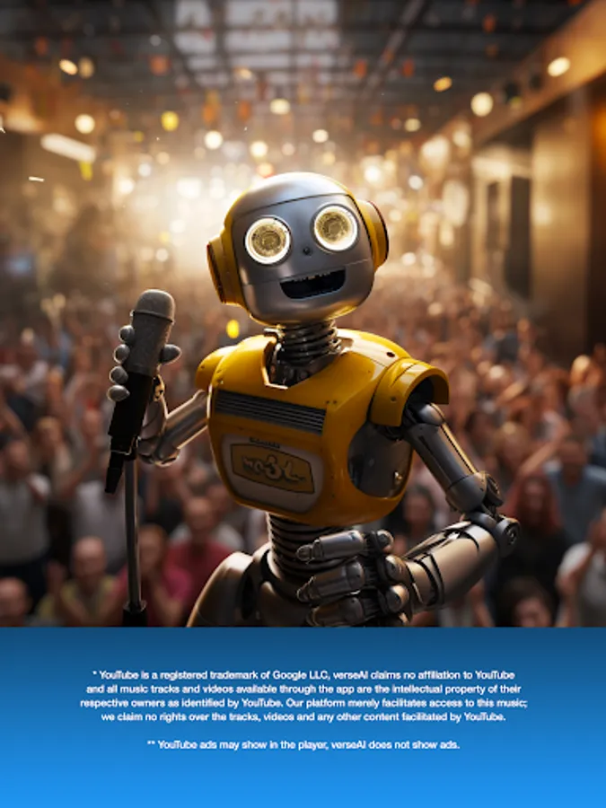* YouTube is a registered trademark of Google LLC, verseAI claims no affiliation to YouTube and all music tracks and videos available through the app are the intellectual property of their respective owners as identified by YouTube. Our platform merely facilitates access to this music; we claim no rights over the tracks, videos and any other content facilitated by YouTube.
