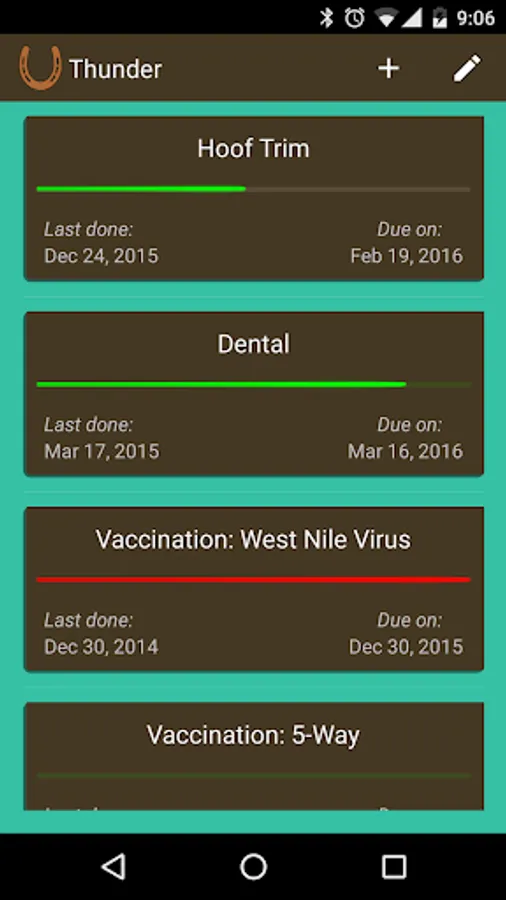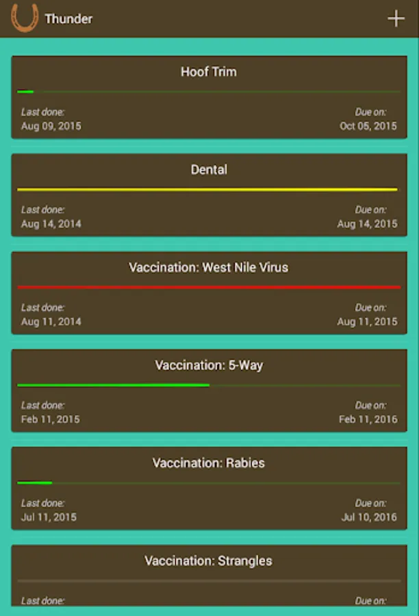 Let EquiTracker help you keep tabs on the items in your horses' unique care routines, including hoof care, vaccinations, or anything else you decide is important to their health and performance!