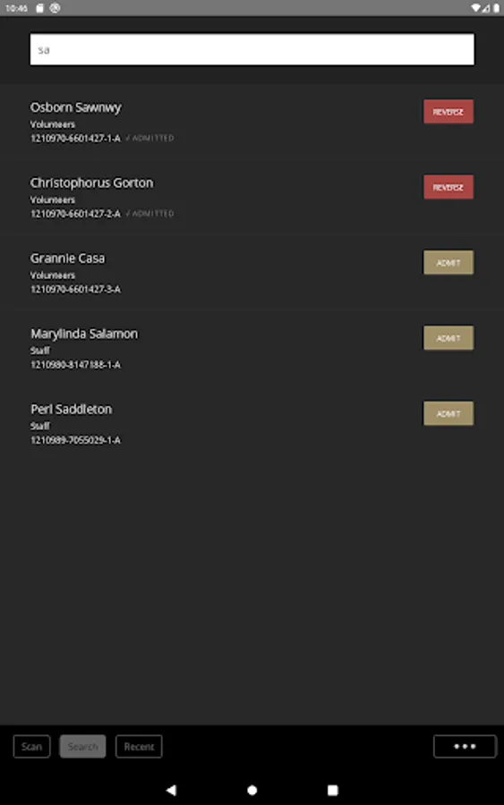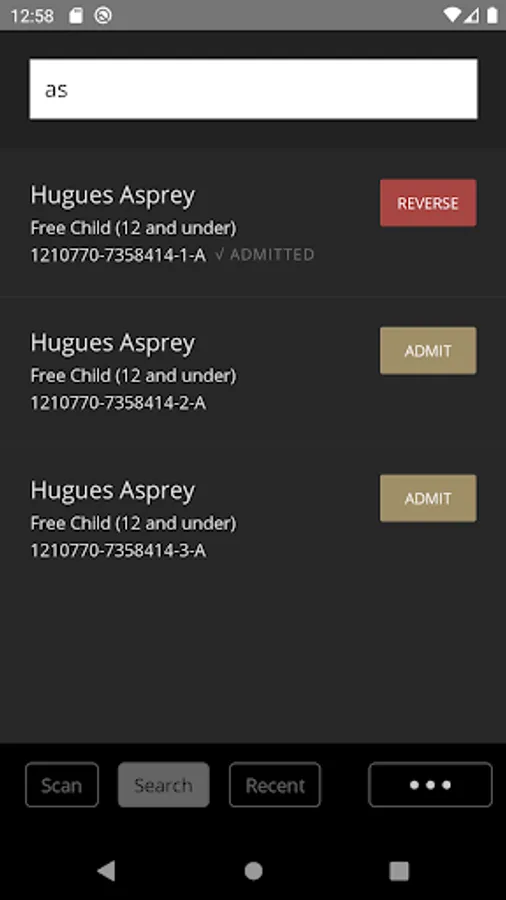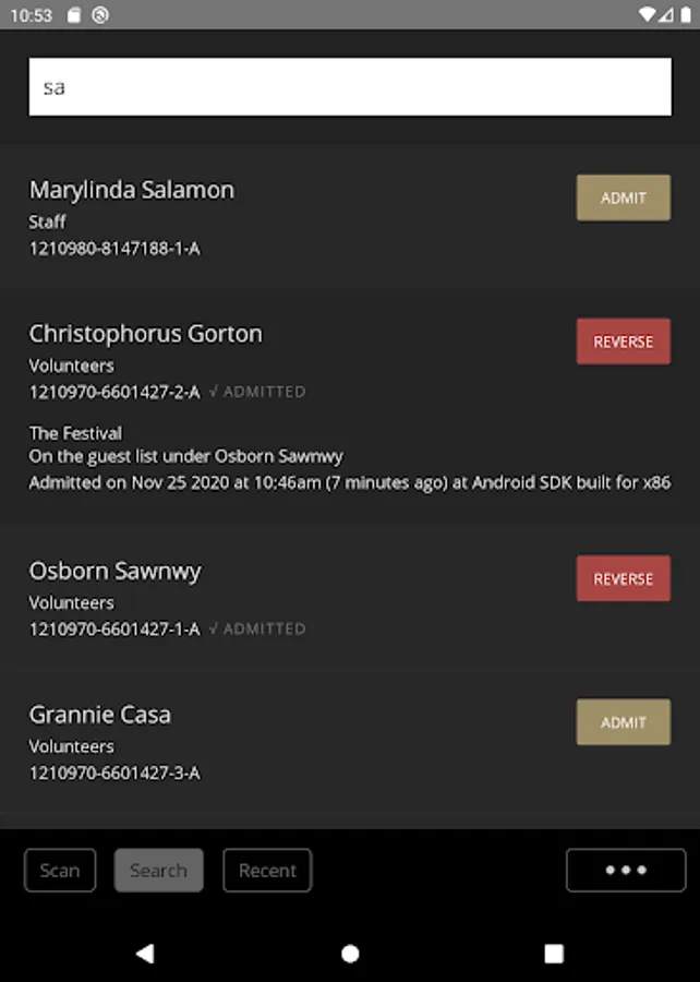 • Search and admit attendees by name, email or ticket number, perfect for when someone forgets their ticket or their paper ticket is un-scannable