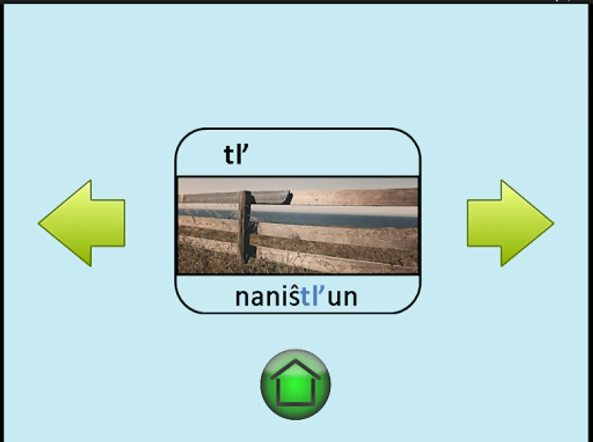 This app is based on the modernized Tŝilhqot’in Alphabet Poster by Bella Alphonse and Aaron Plahn. Hear Bella say the name of each letter and one word that contains that letter, along with a picture.