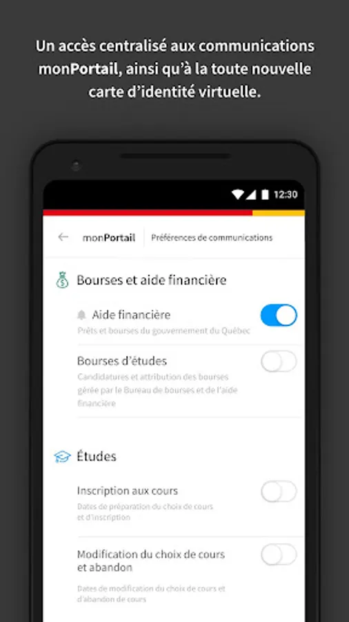 Université Laval is pleased to present the monPortail mobile application! In addition to having access to your virtual identity card at all times, you will be able to see the message thread of myPortail and be notified when a new note is available. No need to refresh the myPortail web page anymore, the application will send you a real-time notification when notes or other important information is available.