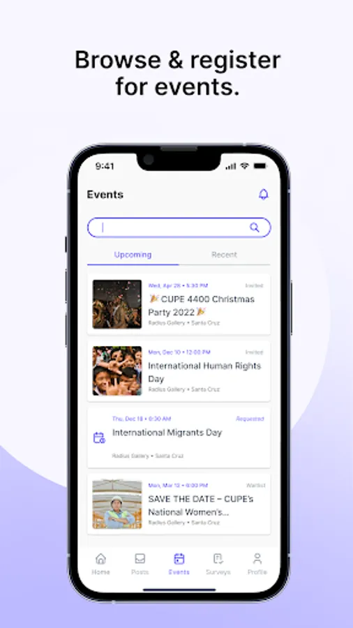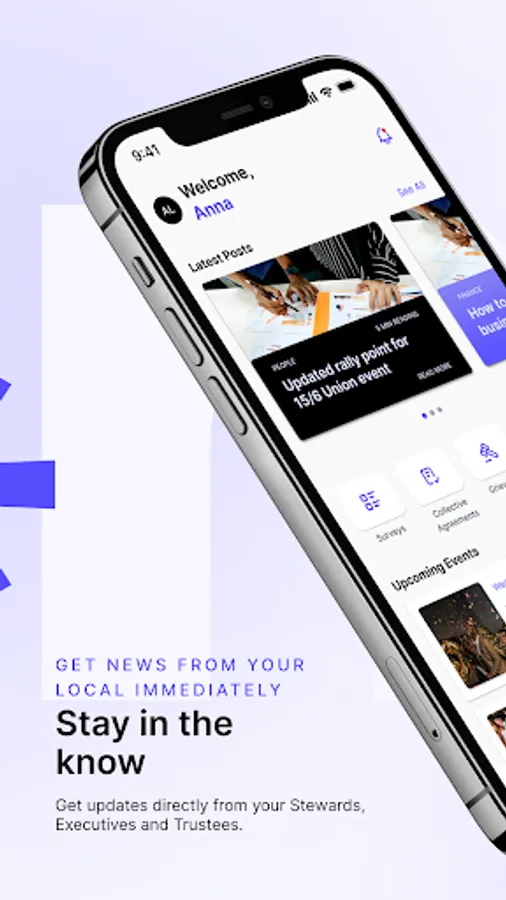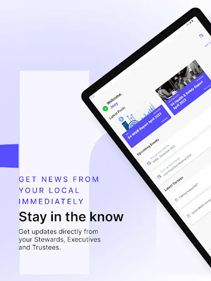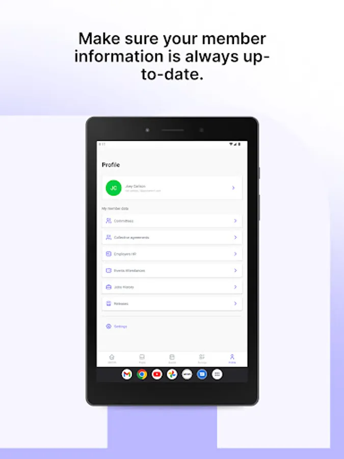 L'application pour les membres met le pouvoir entre les mains des membres pour mettre à jour rapidement leurs informations personnelles. Les membres n'ont pas besoin de se fier uniquement à votre site web pour obtenir des mises à jour, ils peuvent simplement ouvrir l'application et toutes les nouvelles de votre local's y sont, au creux de leur main. L'application pour les membres permet aux membres de s'inscrire à des événements, de remplir des enquêtes et de consulter les articles de la convention collective à des fins de référence sans avoir besoin d'un ordinateur.
