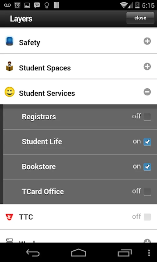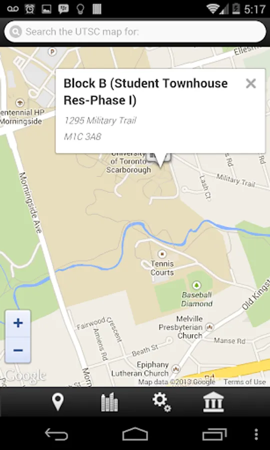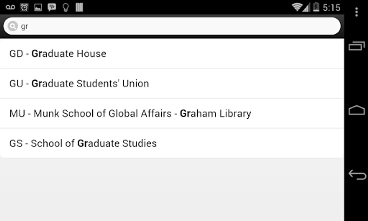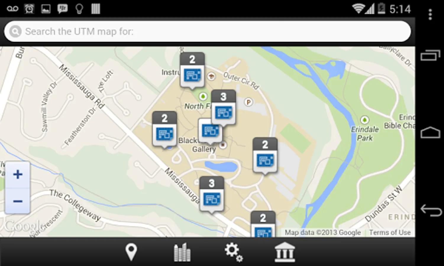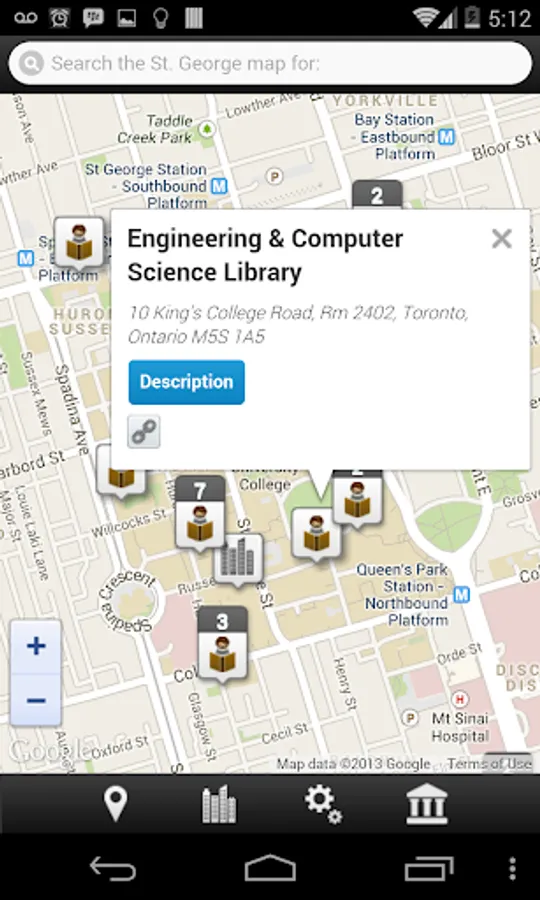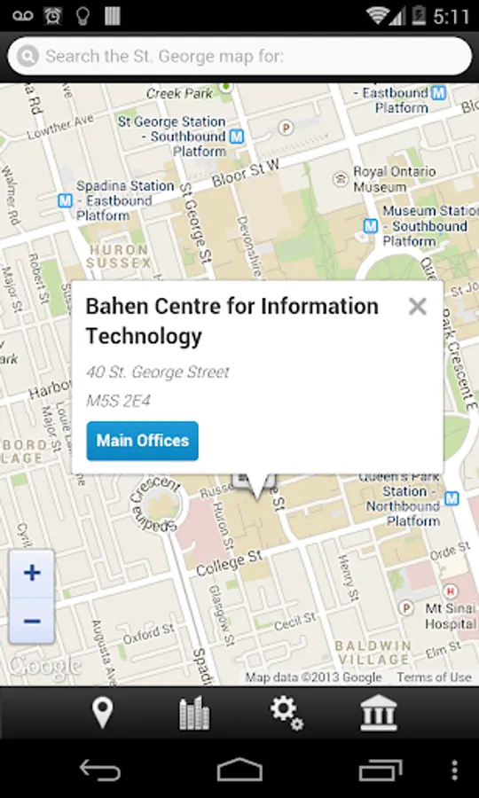 This Google-based, layered map designed for the Android helps members of the U of T community, particularly people who are new to the campus (St. George, Mississauga or Scarborough), navigate using meaningful search words, such as "library" and "registrar". The first map layers include accessibility, food, wireless, student services (including registrars), car parking, bike racks, TTC subway stations, green sites (including green roofs and battery drop-off sites), safety, study spaces and washrooms. The map comprises a complete listing of all the buildings with information about offices and services available inside them. It is a living map, one that will develop more layers as it grows.