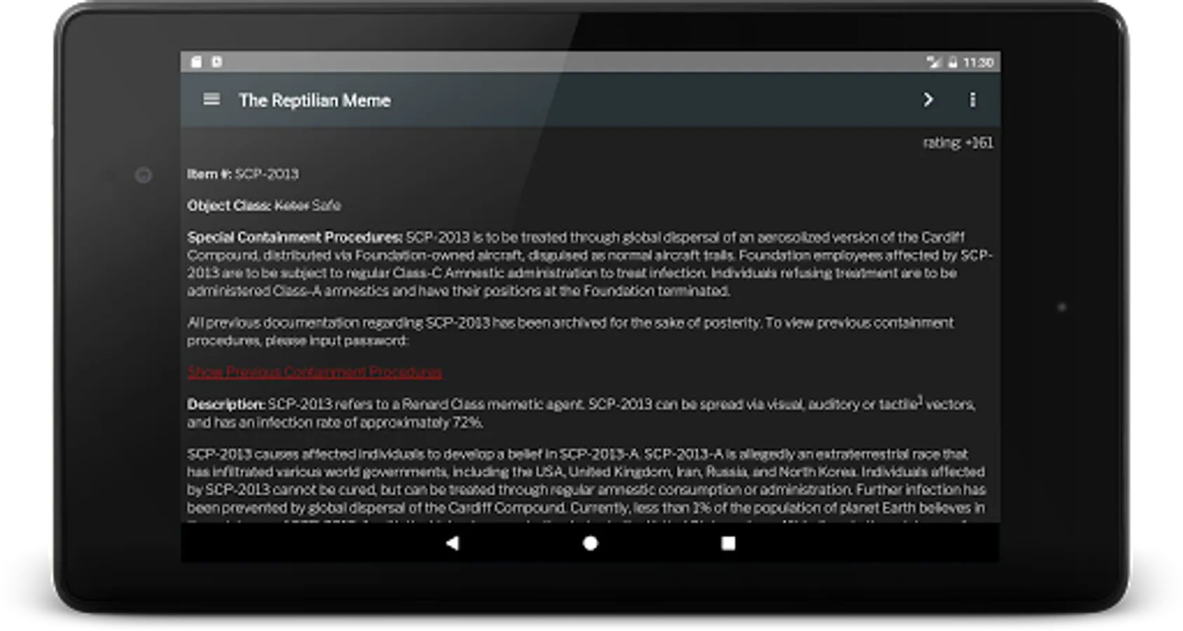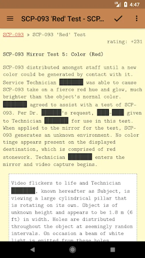 Read about anomalous items, beings, and locations from the SCP Wiki with this immersive reader app. Supports SCP Series 9!