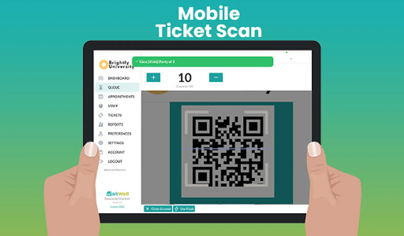 Visitors do not need to download an app - they can join your queue by QR code, weblink or SMS Text. Staff can manage the queue through a web browser or using the WaitWell Staff App. The WaitWell Staff App allows staff to add users to the queue, assign and edit tickets and scan tickets to verify admittance and automatically control capacity at busy locations and events.