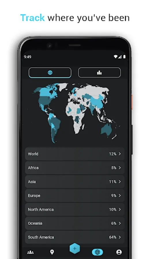 Inside our progress page, you can track all the countries you’ve visited with our interactive scratch map. The scratch map visualizes your visited countries and lists your total percentage in every continent. As well as track progress of your achievements within the app of places you've been, markers uploaded and marker accepted to the WorldBuddy main map!