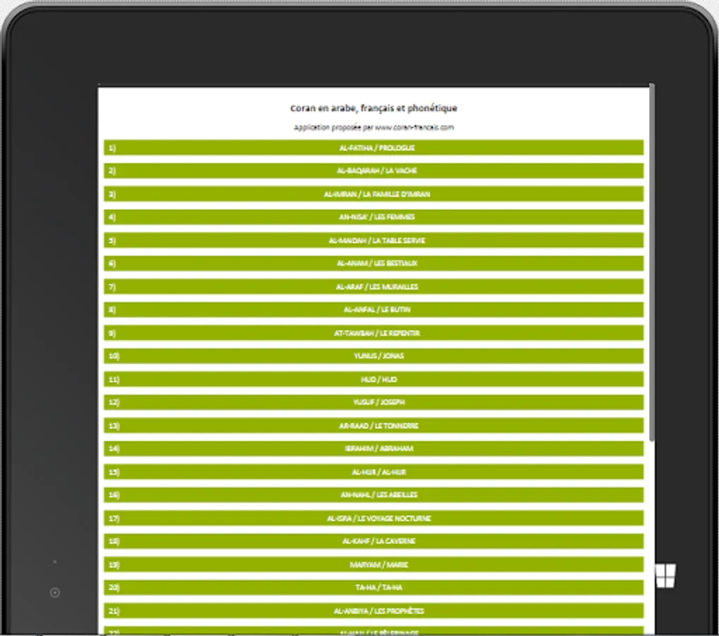A keyword search engine to find a verse or surah is also available on Coran-francais.com.
