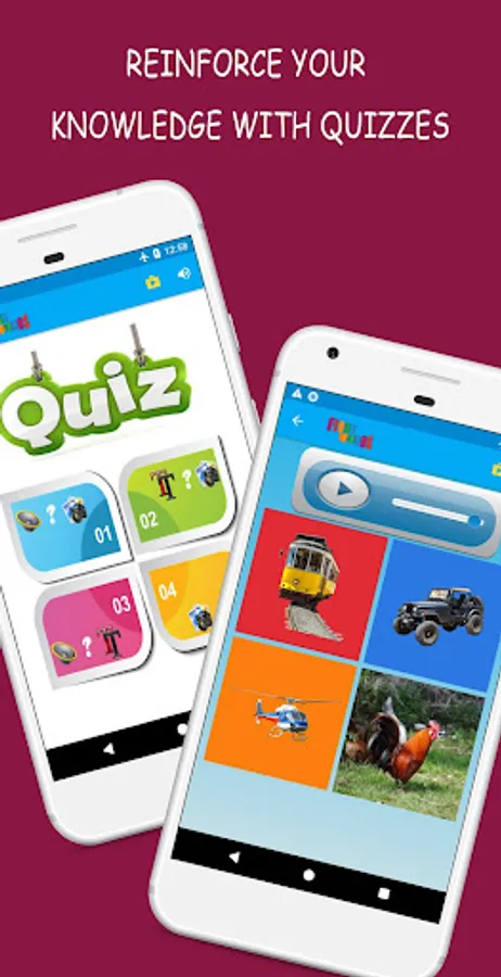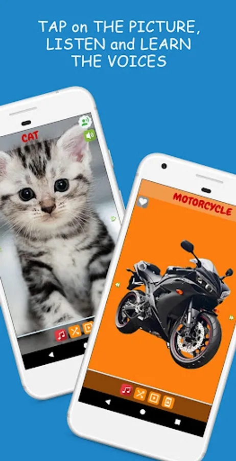 • First Words for toddlers ensure that the intended children learn their first words fun and faster. Dog voice, sheep voice, truck voice, motor voice. Let’s see these voices together with the visuals and reinforce with quiz and play.
