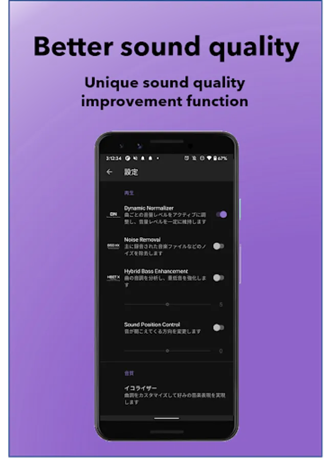 Sound quality to improve music listening, such as dynamic normalizer, bass enhancement function "Enhancement", noise reduction function "Noise Removal", and "Sound Position Control" that can change the direction in which sound is heard. It is equipped with many improvement functions.