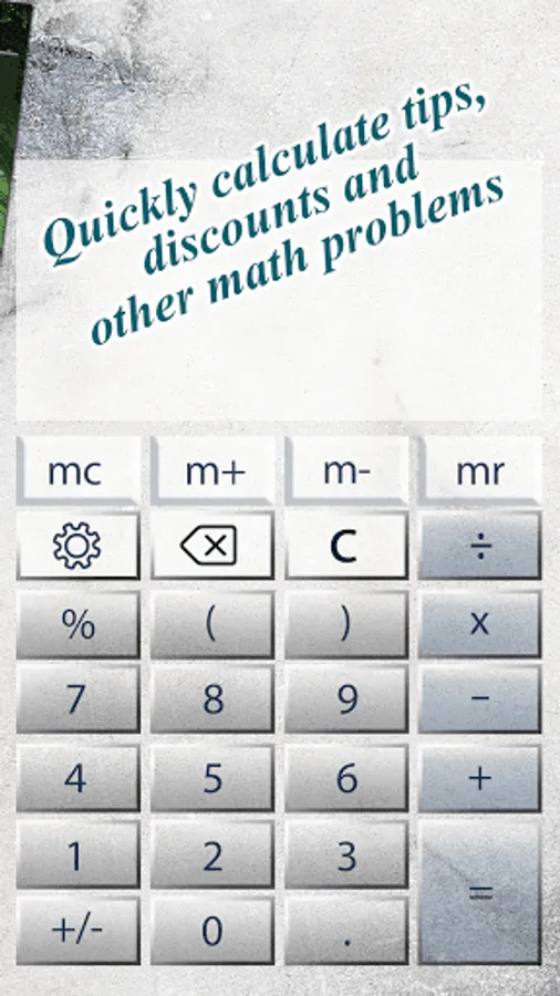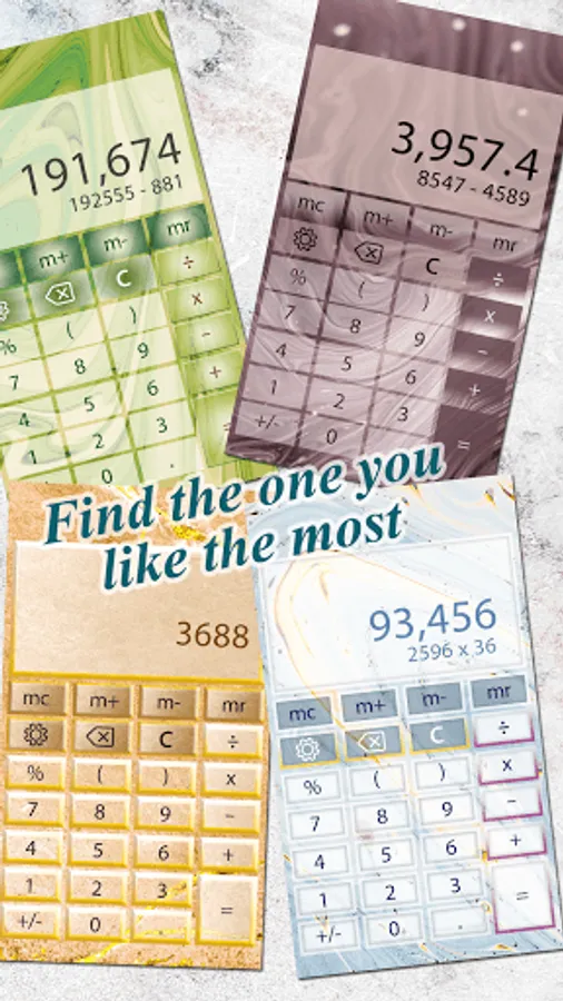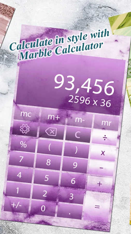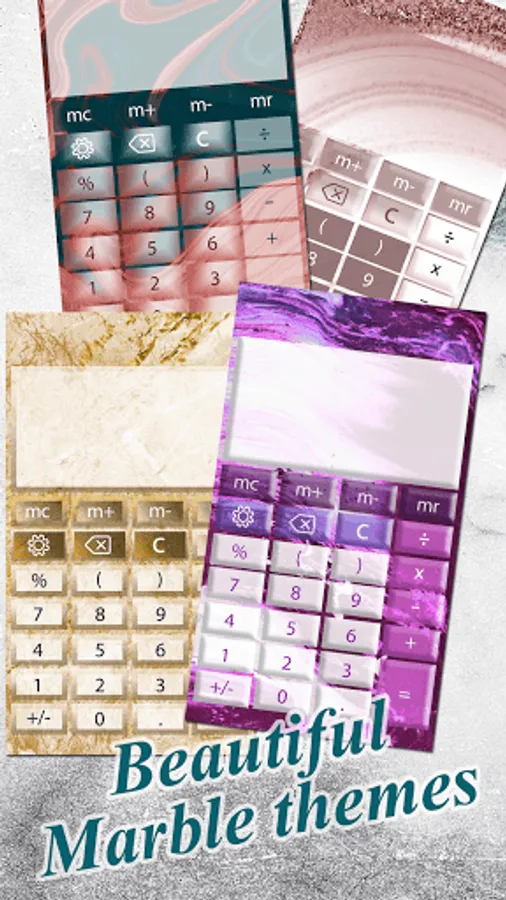 Personalize your phone with the fanciest phone accessory and a must have app for everyone. Grab Marble Calculator and quickly solve every single math calculation! Use this simple calculator to calculate tips, discounts and lots of math problems! Install calculator marble for free and have fun with the most amazing colorful calculator you have ever seen with marble themes and amazing marble backgrounds! The sophisticated look of our colorful calculator app is both fun and easy to manage! If you want to have a fun marble calculator app in your phone, this amazing math calculator is made just for you. Choose colorful, stylish themes to brighten your day while you calculate with ease. Find your favorite marble theme just a swipe away from you.
