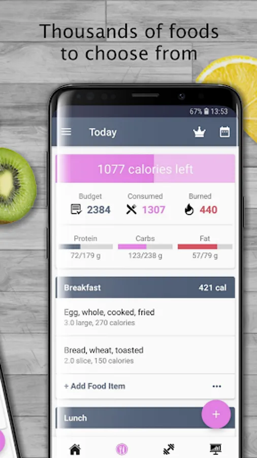 Counting calories has never been so easy. Our integrated database contains thousands of food items and exercises, with the ability to quickly add your own custom items. Our simple, elegant design makes logging your meals and workouts a breeze.