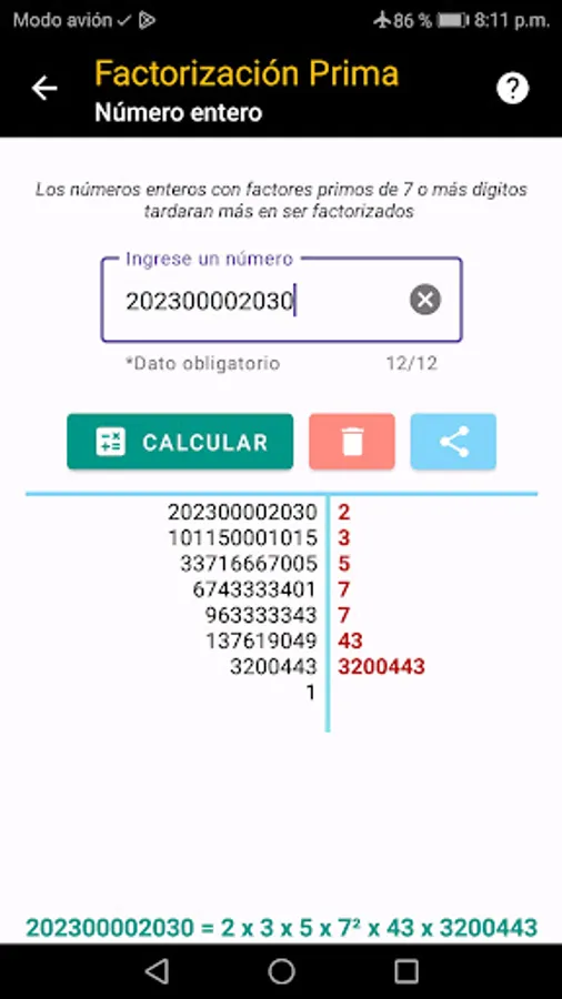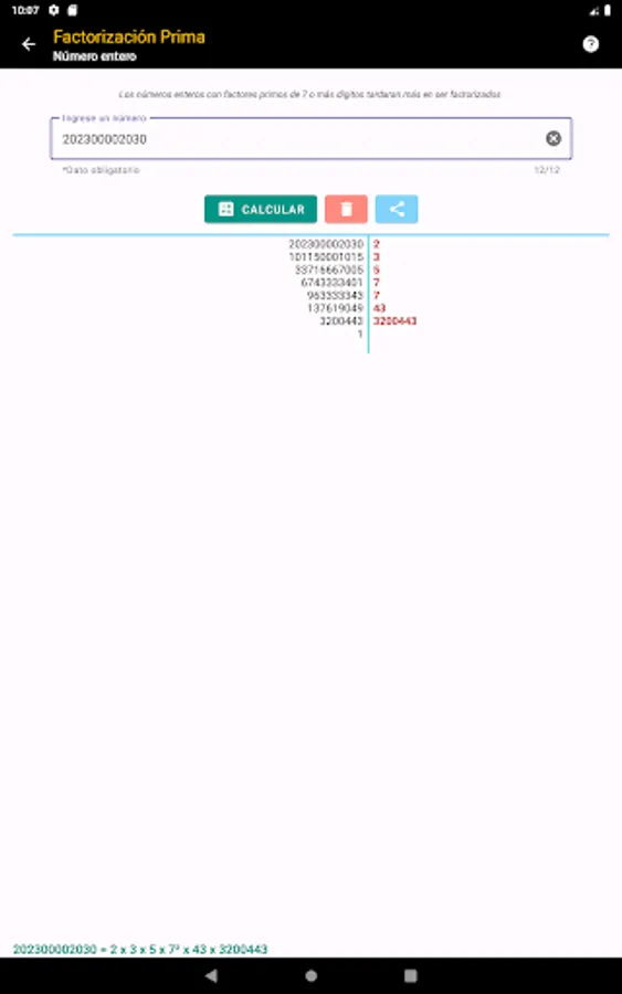 Our Factorization function breaks numbers up to twelve digits into their prime factors, thanks to an optimized algorithm that guarantees fast and accurate answers.