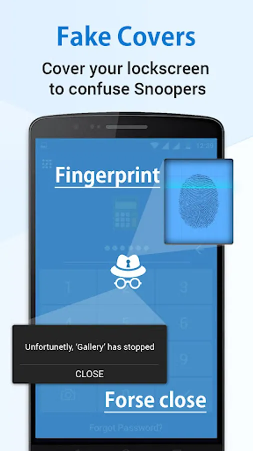 Disguise your app lock screen to prevent from breaking into your password. Fingerprint scanner and fake force close design will help you hide the real app lock screen.