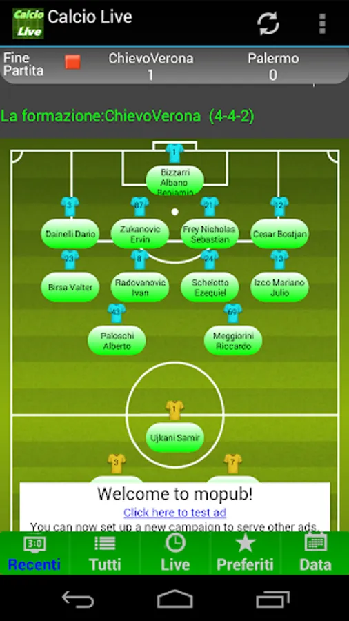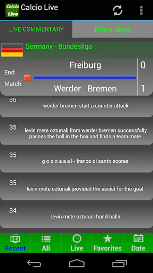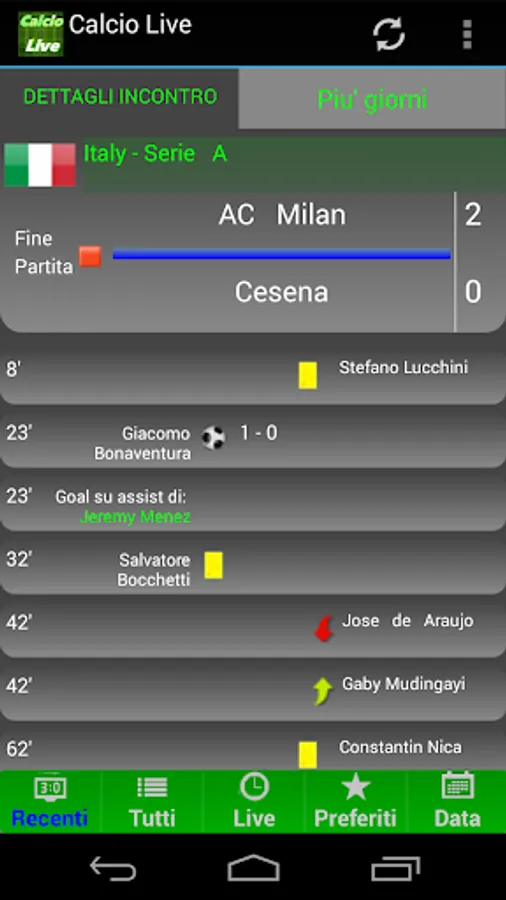 Detailed information on the match selected, goals/markers, Yellow/red cards, substitutions,