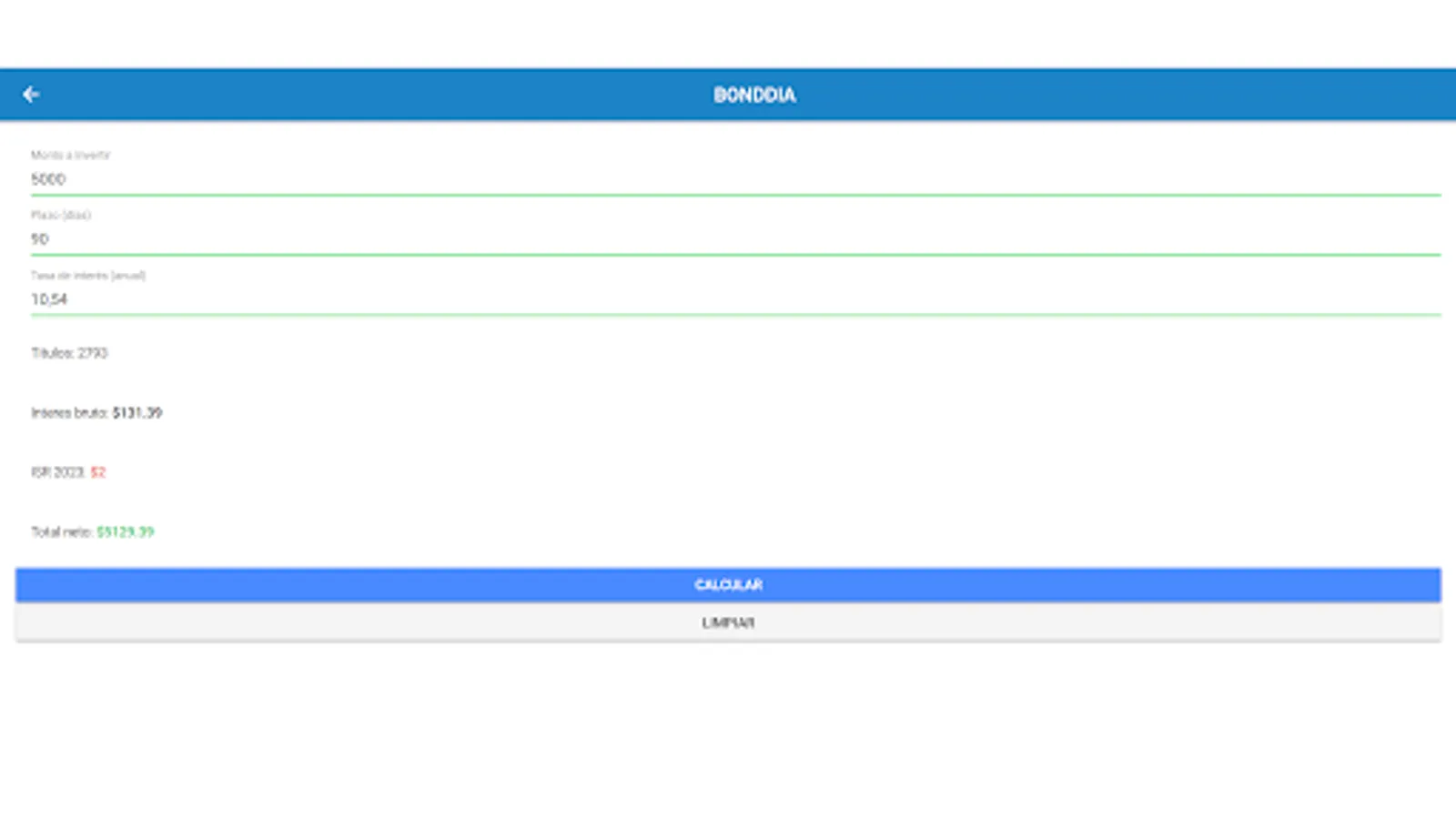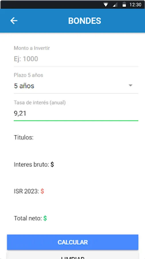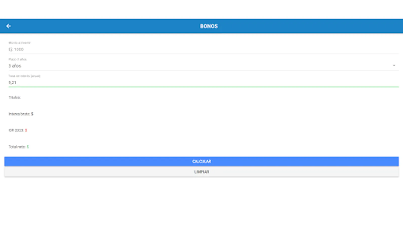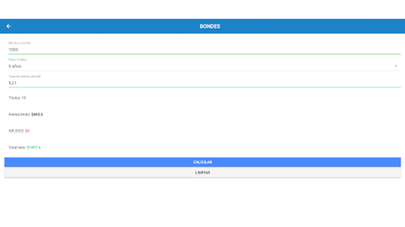 The application has a wide range of intuitive features and functionalities that will facilitate the process of calculating your returns. Simply enter the amount of your investment, select the type of financial instrument you are interested in (cetes, udibonos, bondes, bonds or bonddia) and set the relevant parameters, such as the interest rate and investment term.